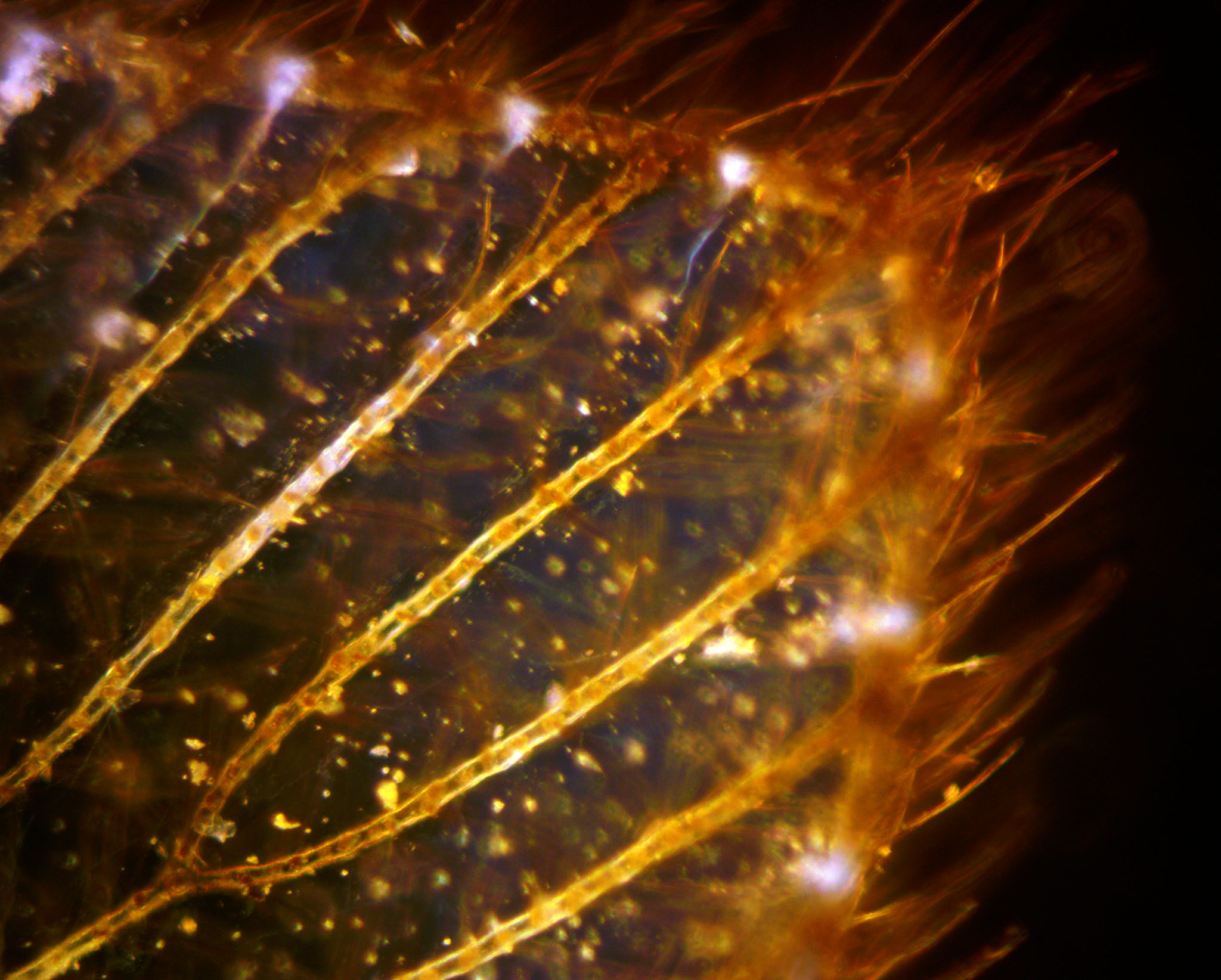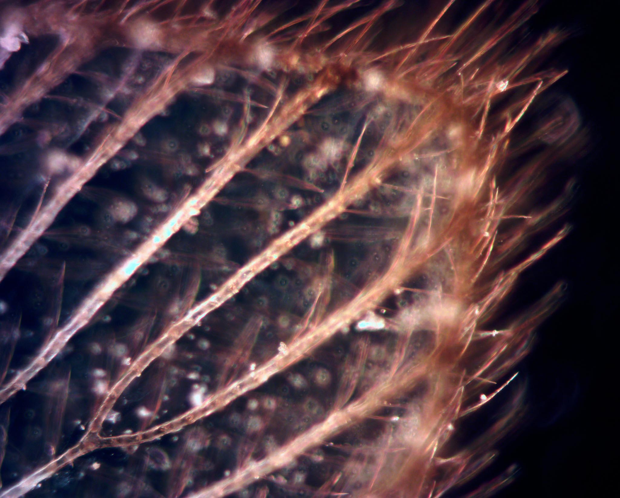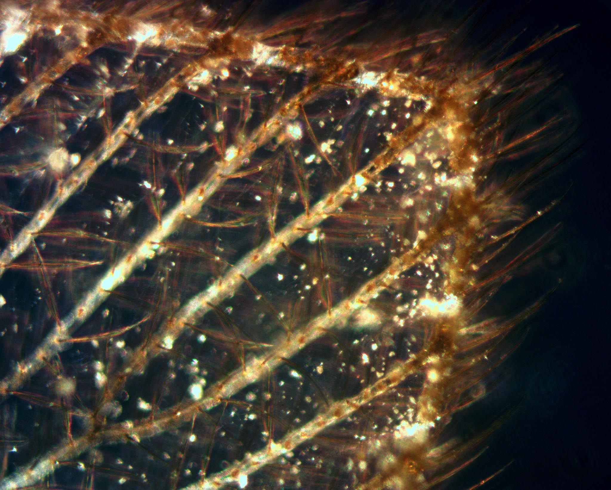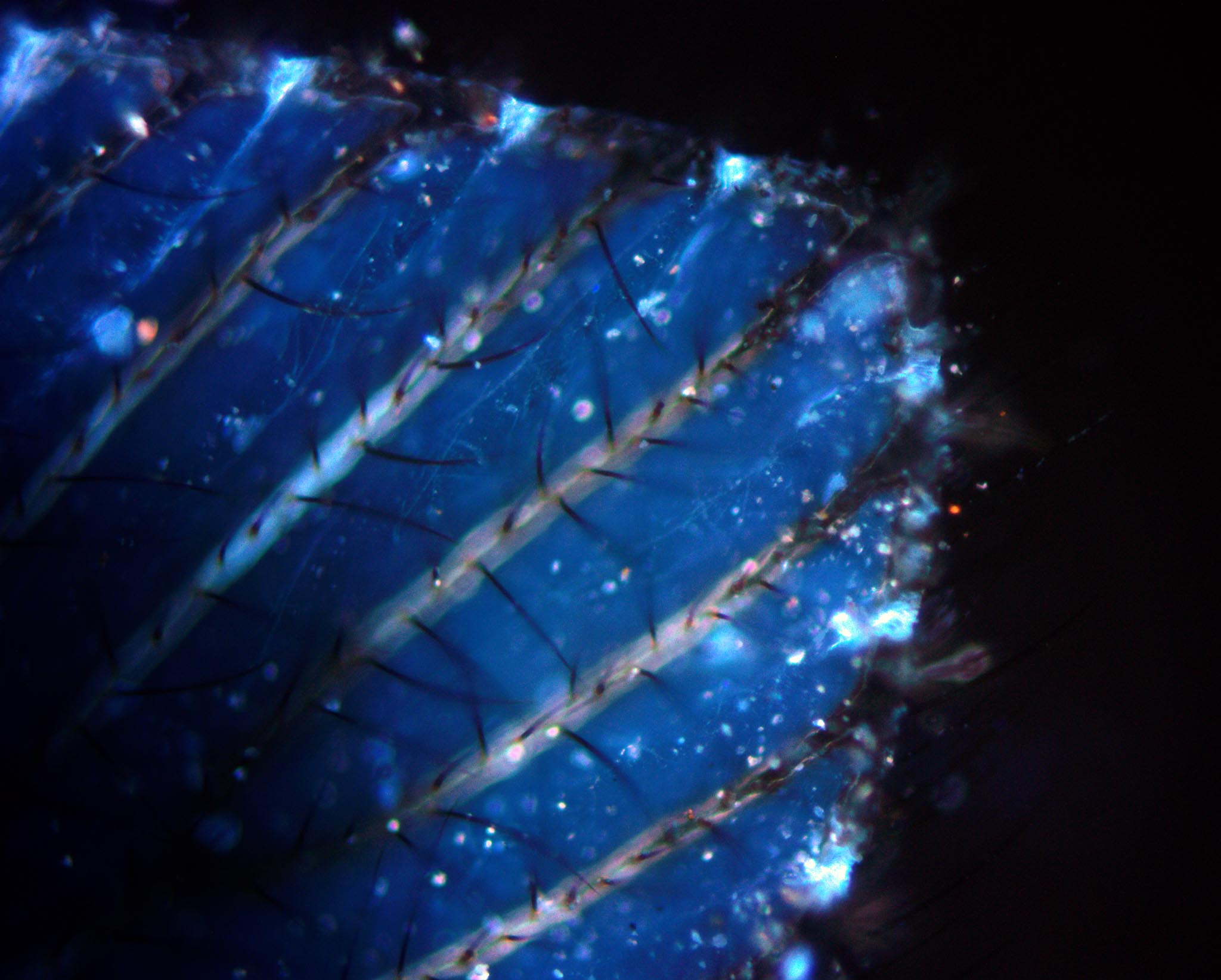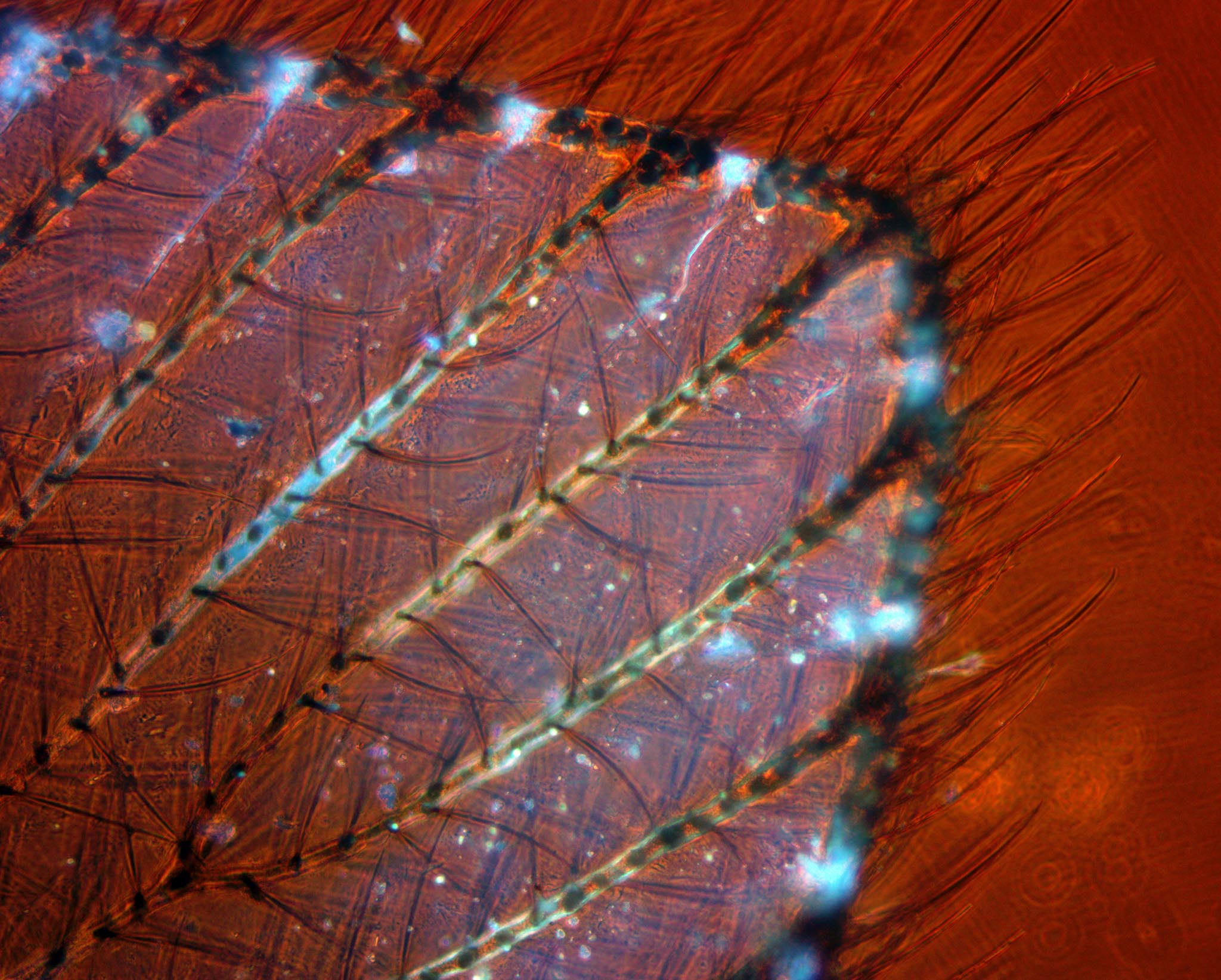 Here we are observing the very tip of the wing with 10x objectives. First is brightfield, darkfield, crossed polarizers and phase contrast (Ph2).