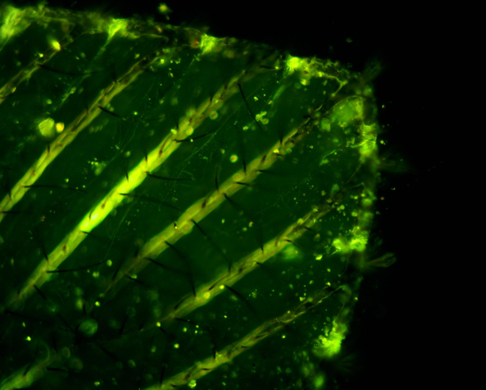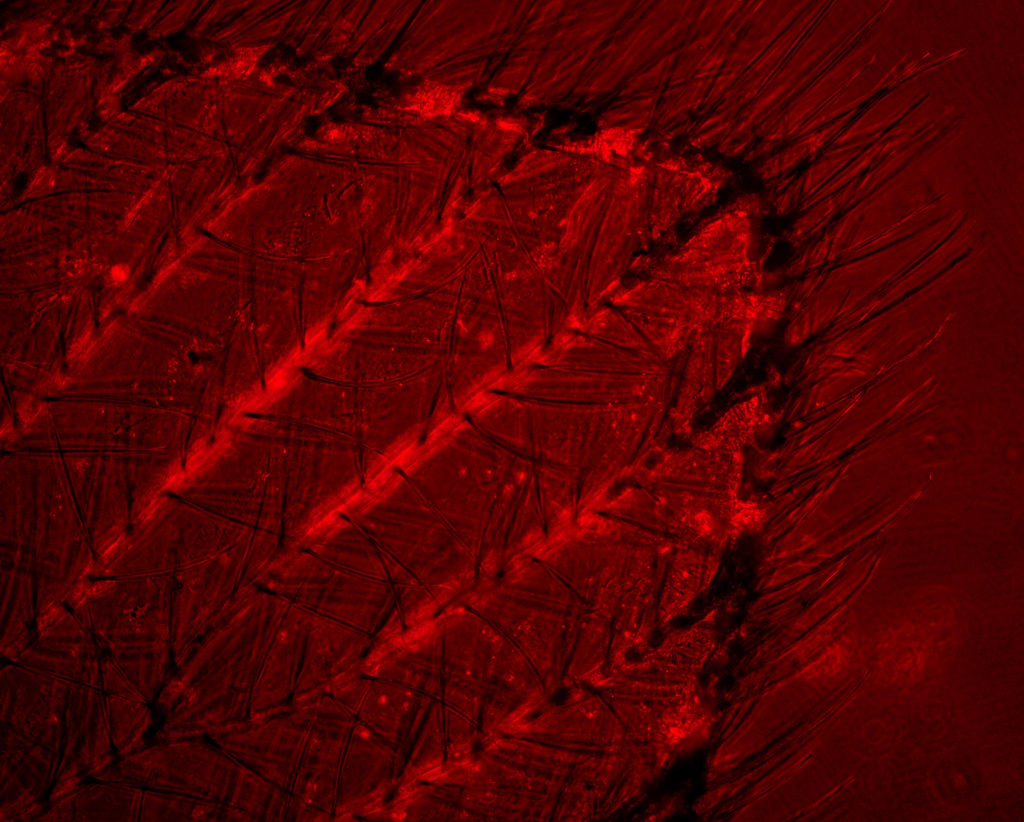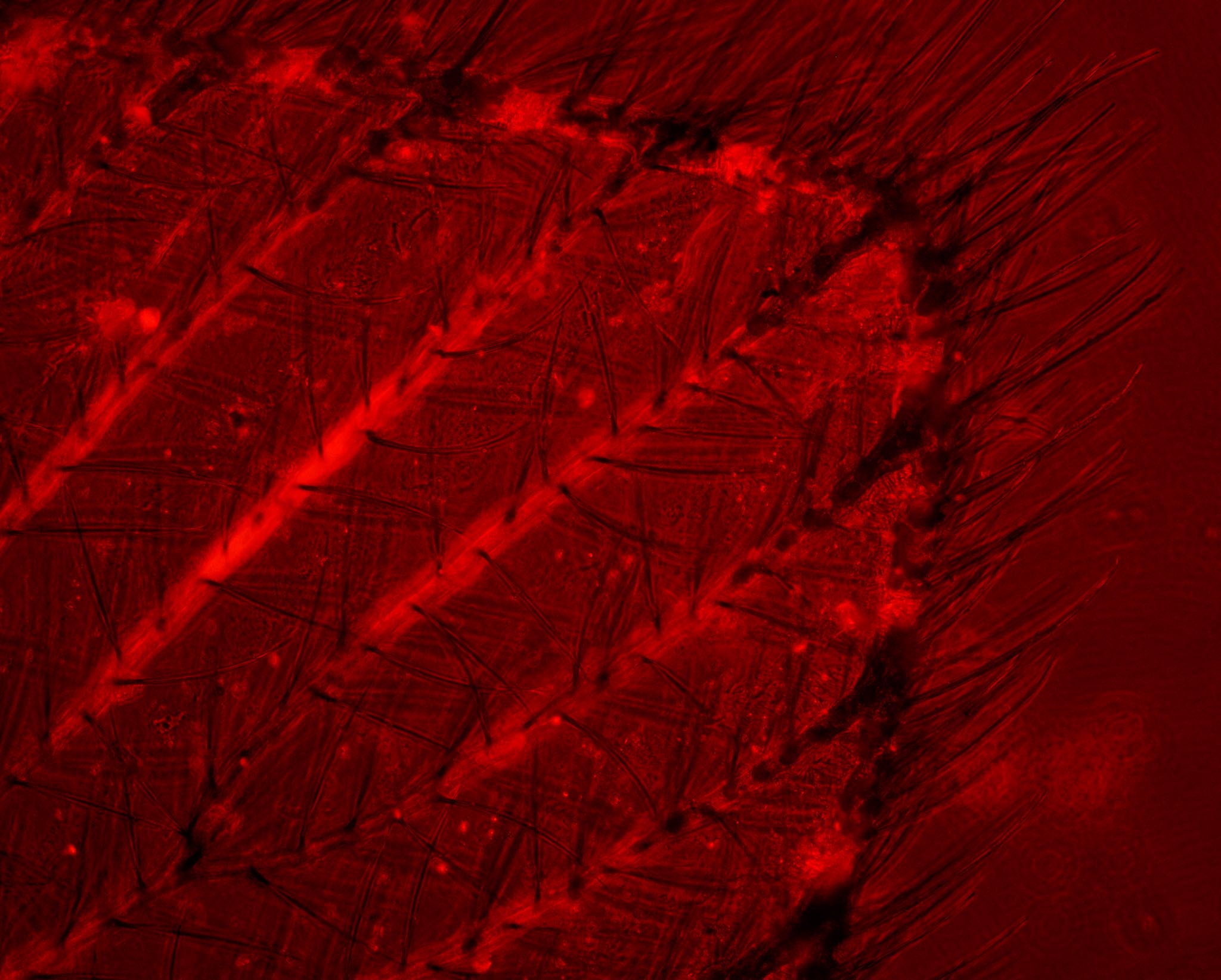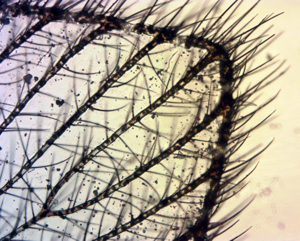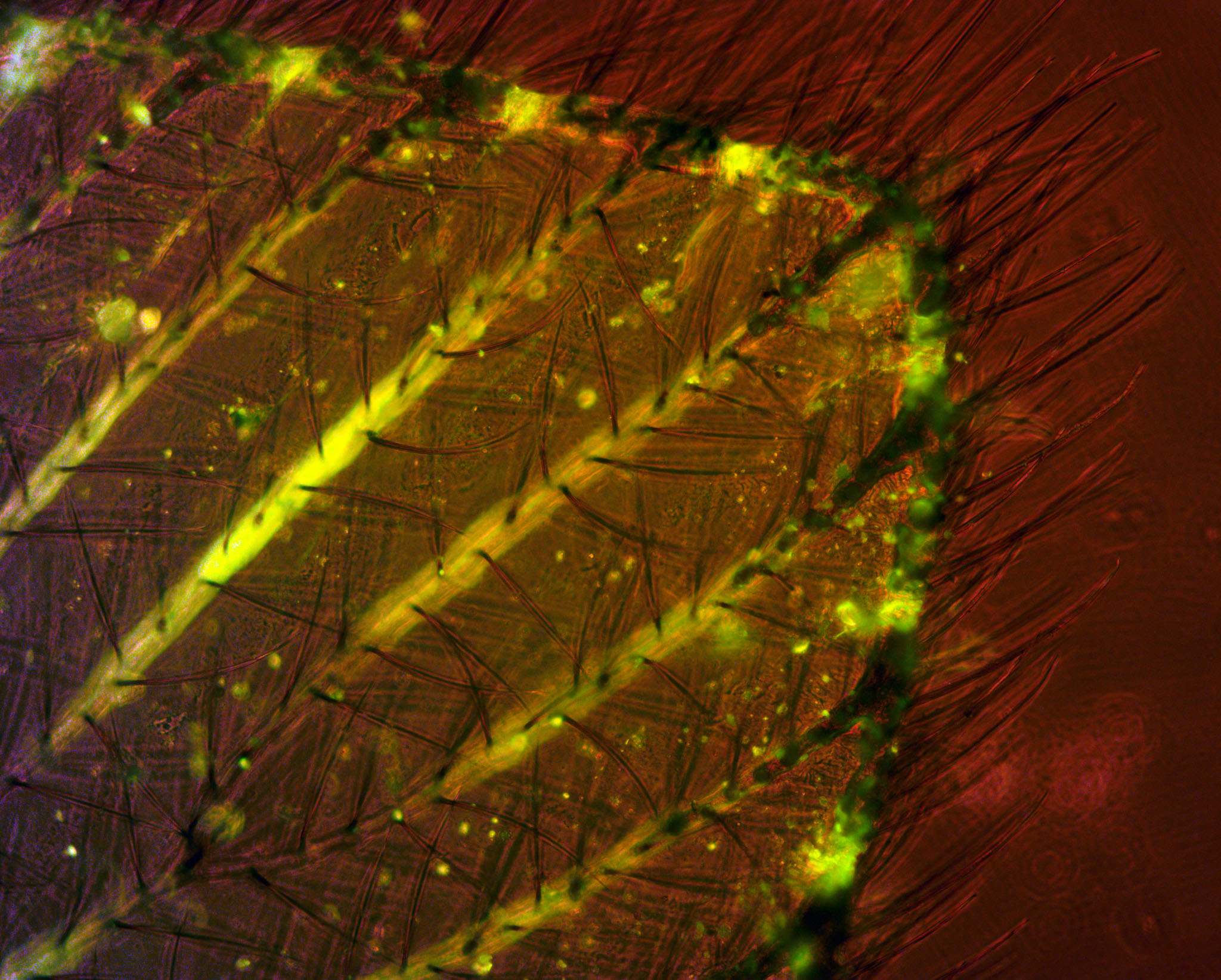Here we are observing the very tip of the wing with 10x objectives. First is brightfield, darkfield, crossed polarizers and phase contrast (Ph2).