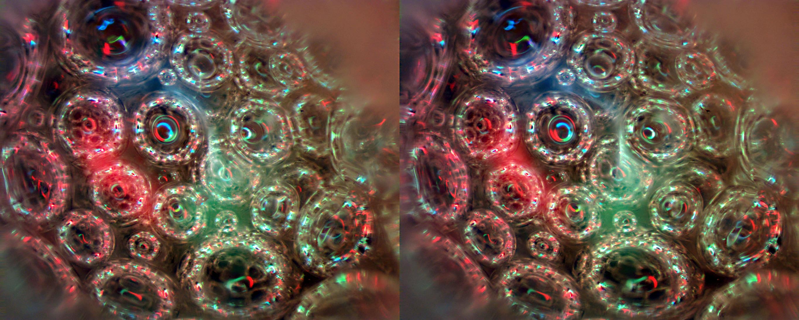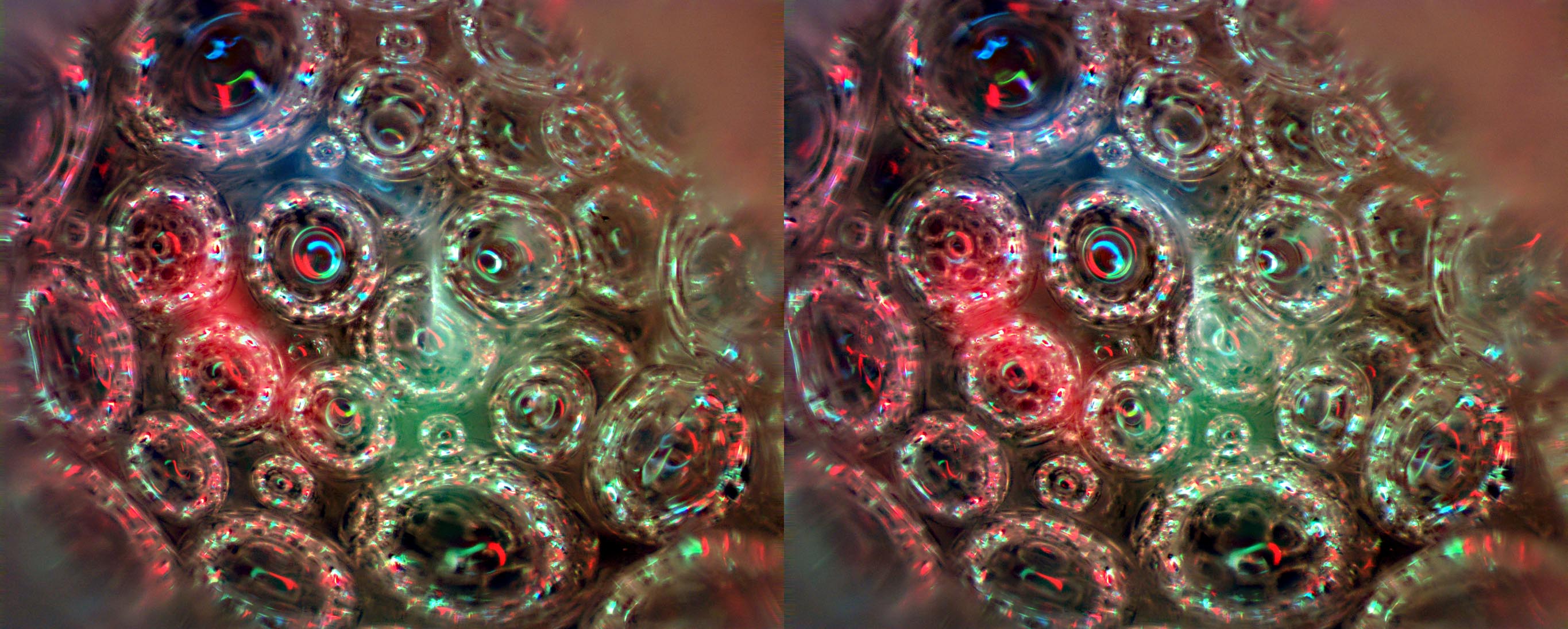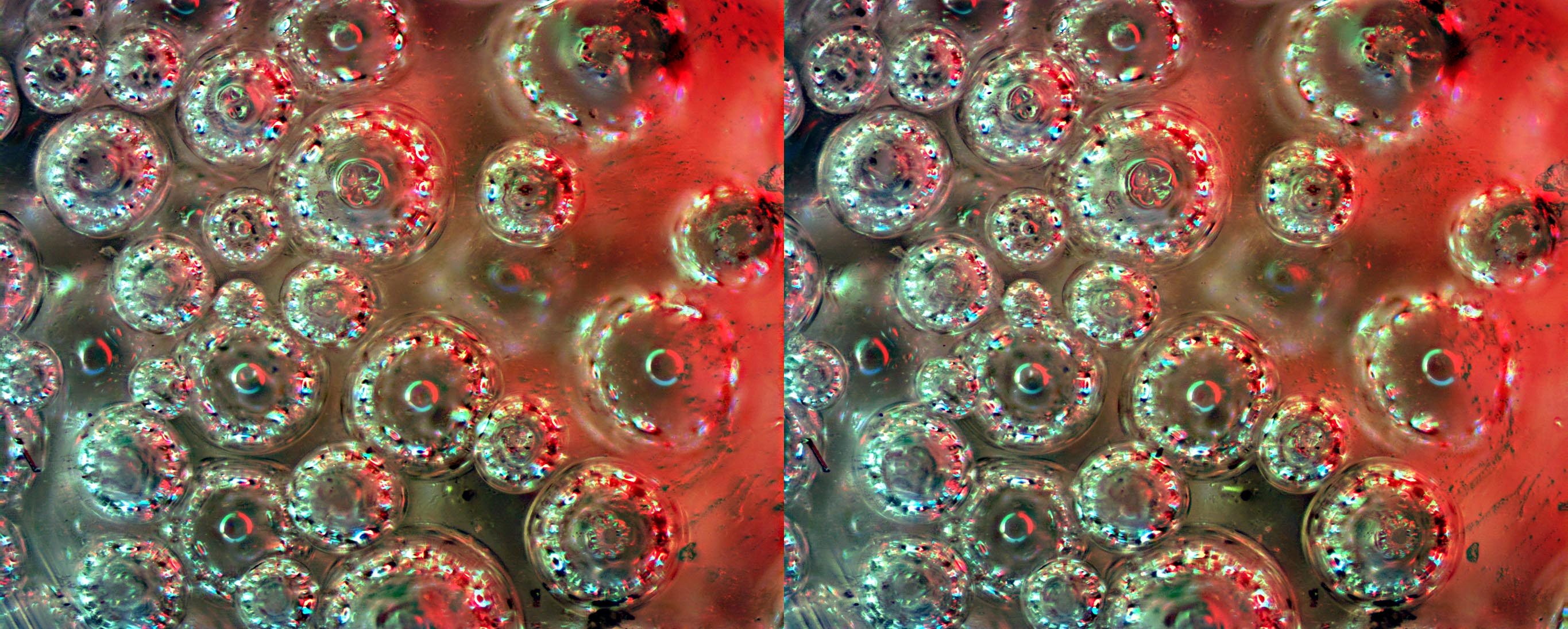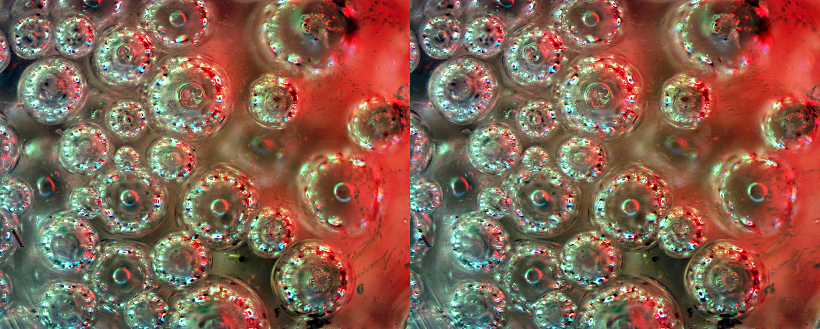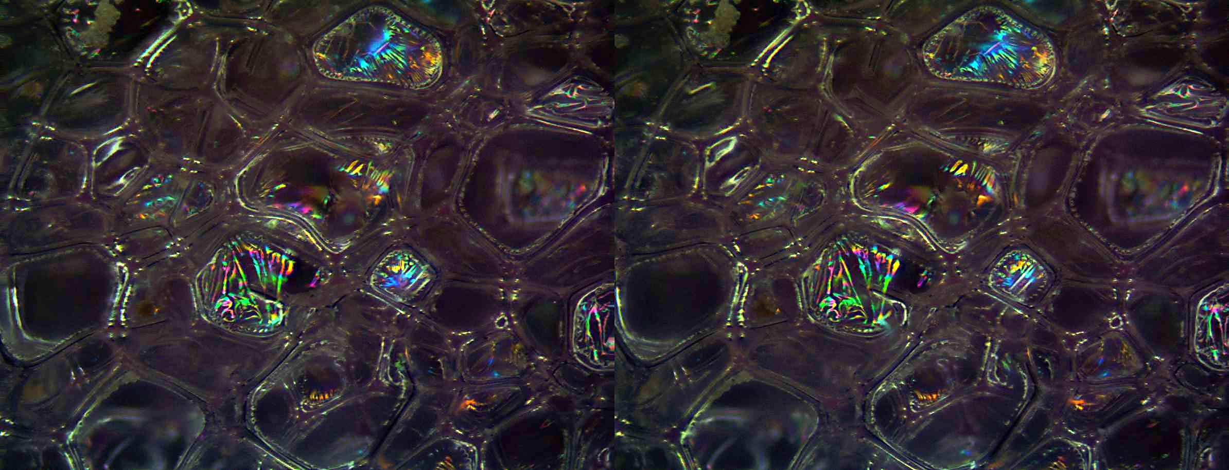 Again with the 5x BD Plan, I took the following stack of 65 images of pink anti-static open cell foam. The colors come from thin-film interference, like you see in soap bubbles.