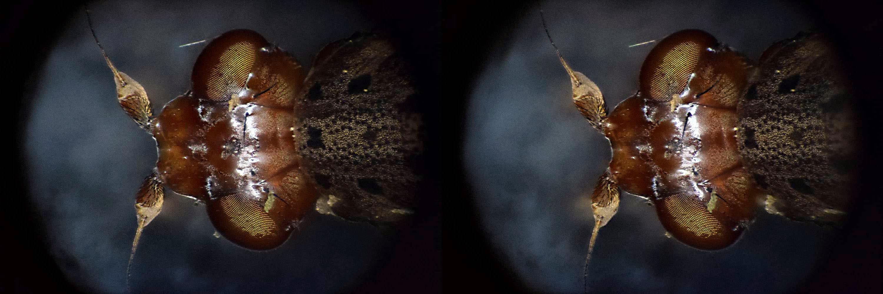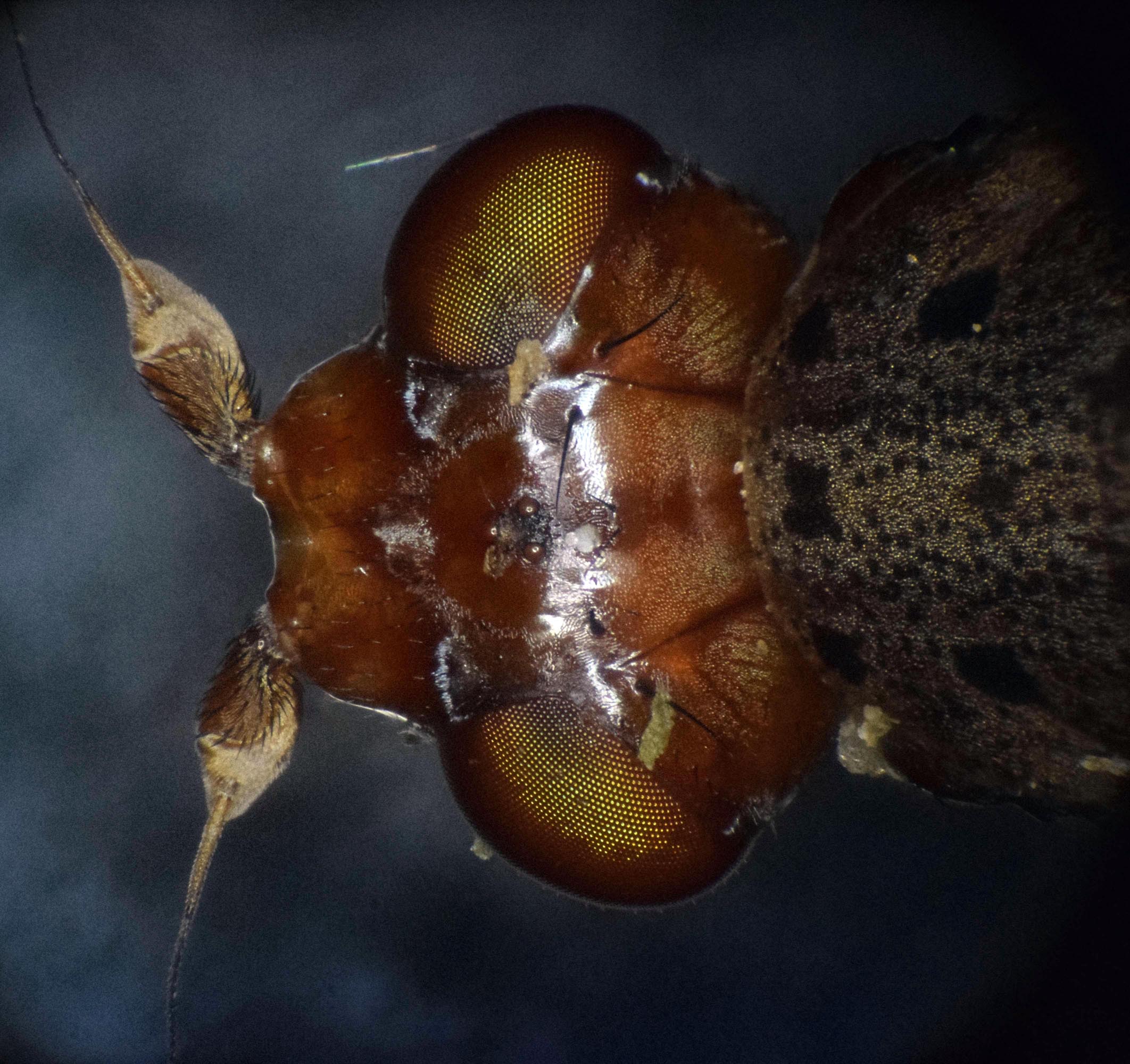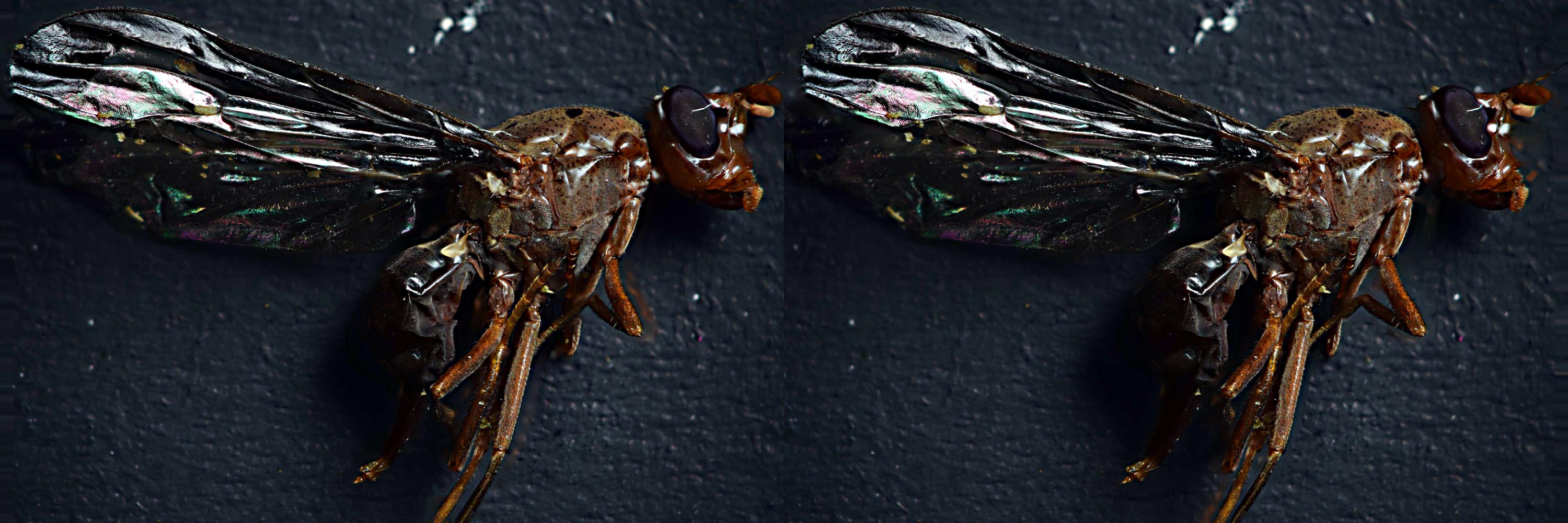 Using a reversed 105 mm focal length medium format lens for the Pentax 67, I obtained the following stack of 37 images of the same fly, but 8 days later.