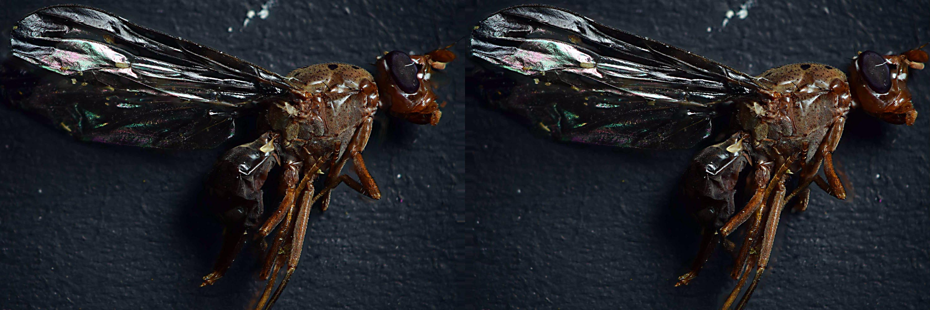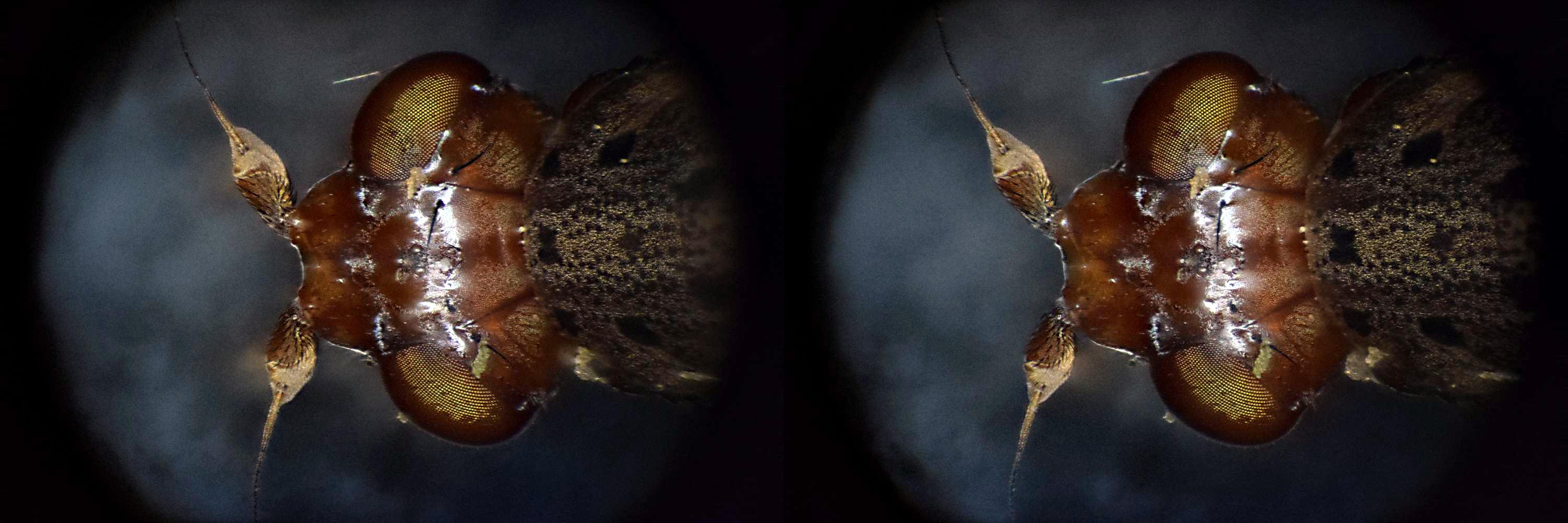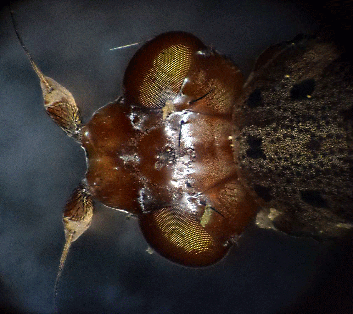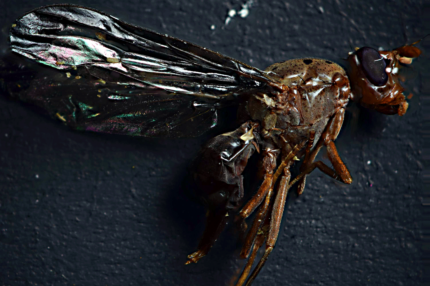 Using a reversed 105 mm focal length medium format lens for the Pentax 67, I obtained the following stack of 37 images of the same fly, but 8 days later.