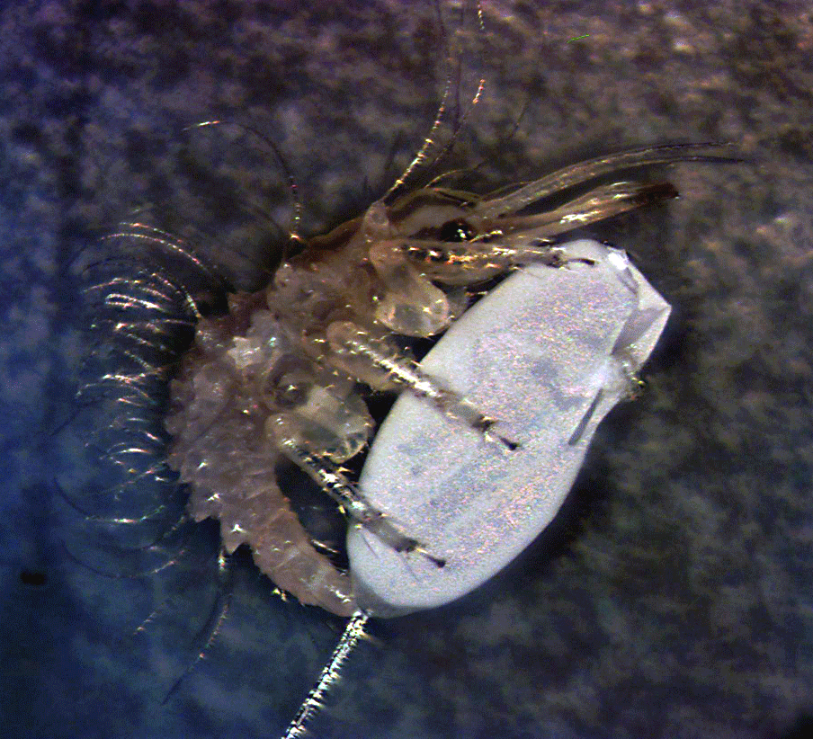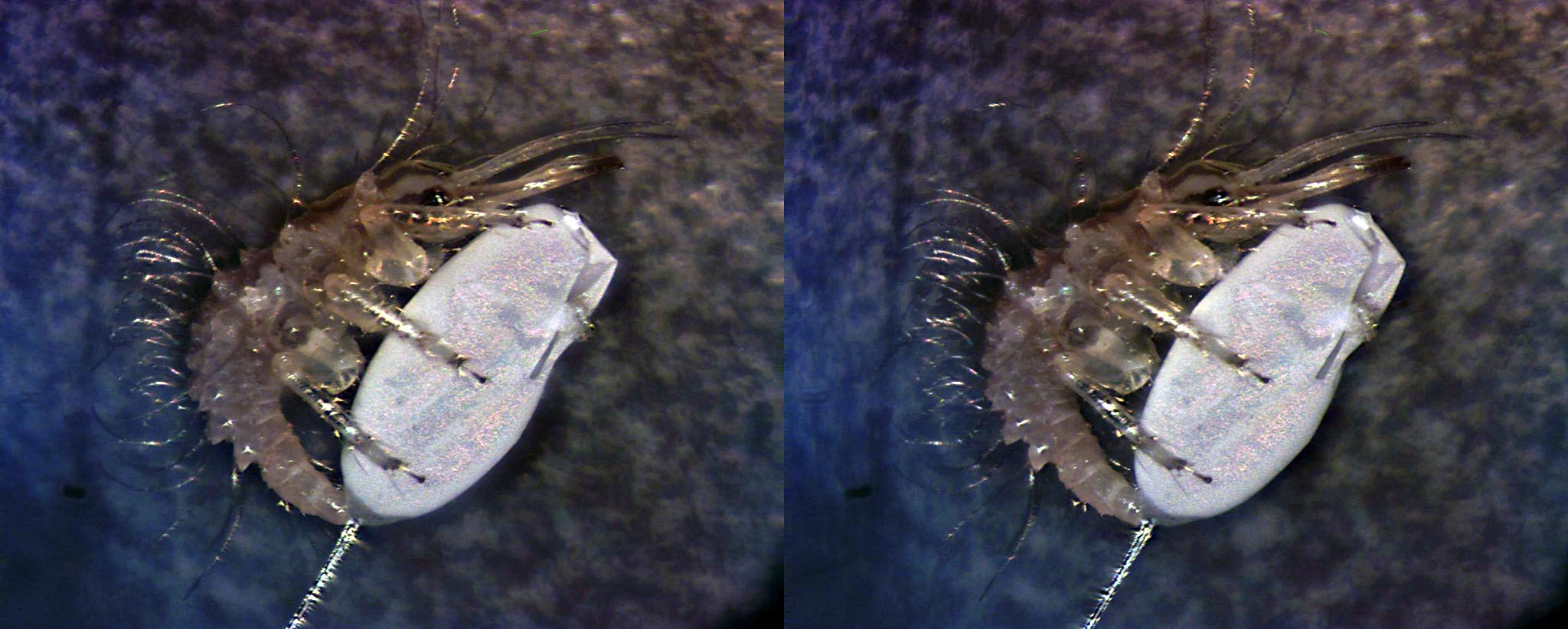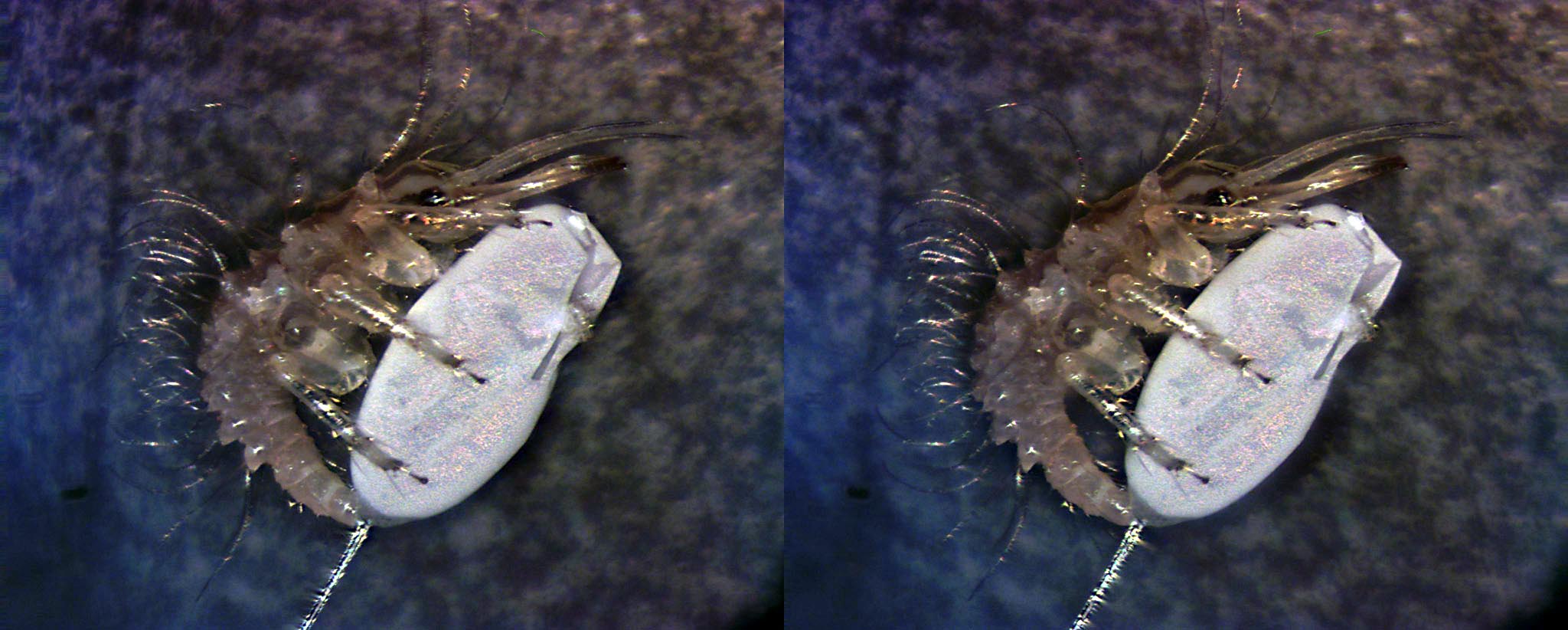 First, shown with a Edmund Optics 2x LWD objective used directly on a 200 mm lens attached to a DLSR, in "extreme macro", and second with a 5x epi-darkfield BD objective.