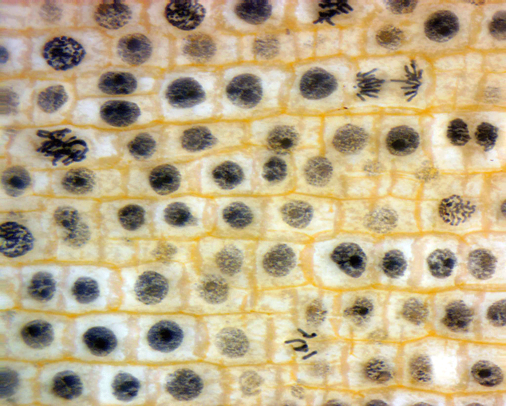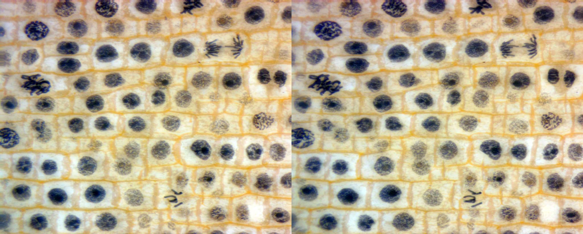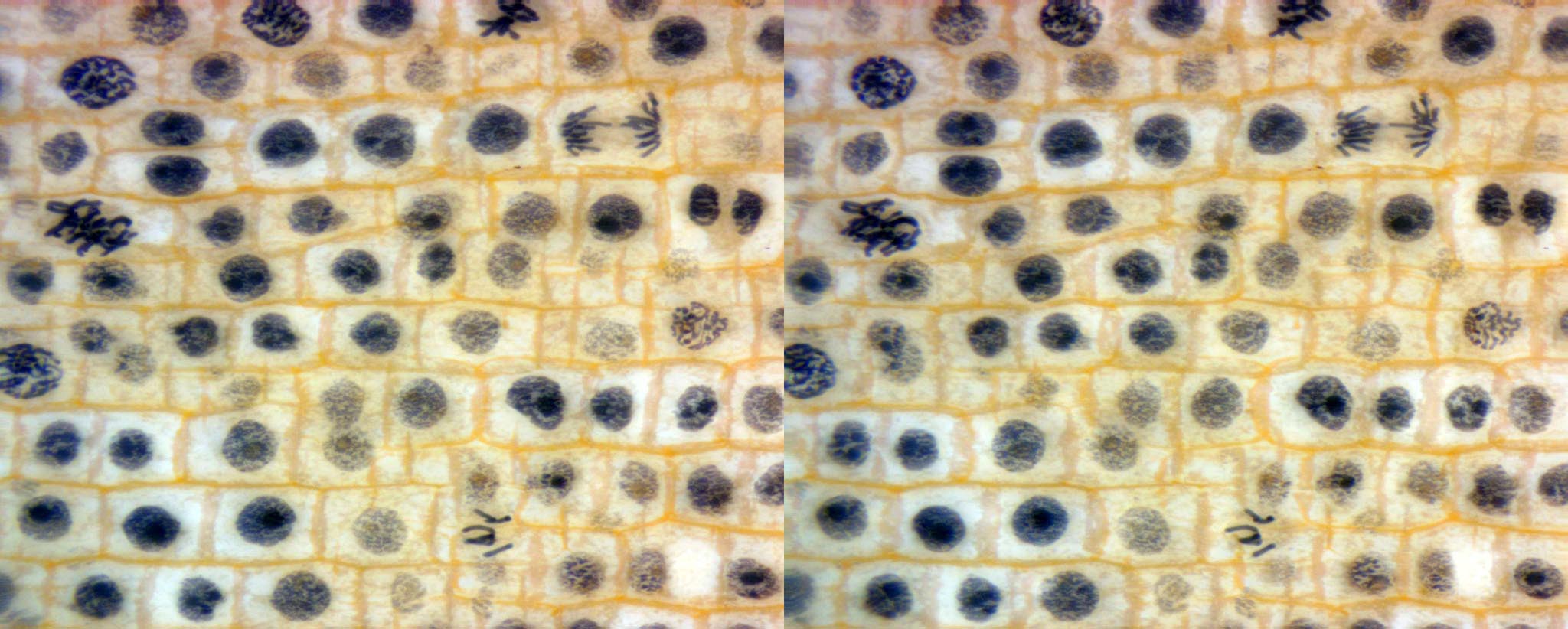 Next, a 60x Plan Apo oil image of multiple layers of onion cells in various stages of mitosis (cell division).