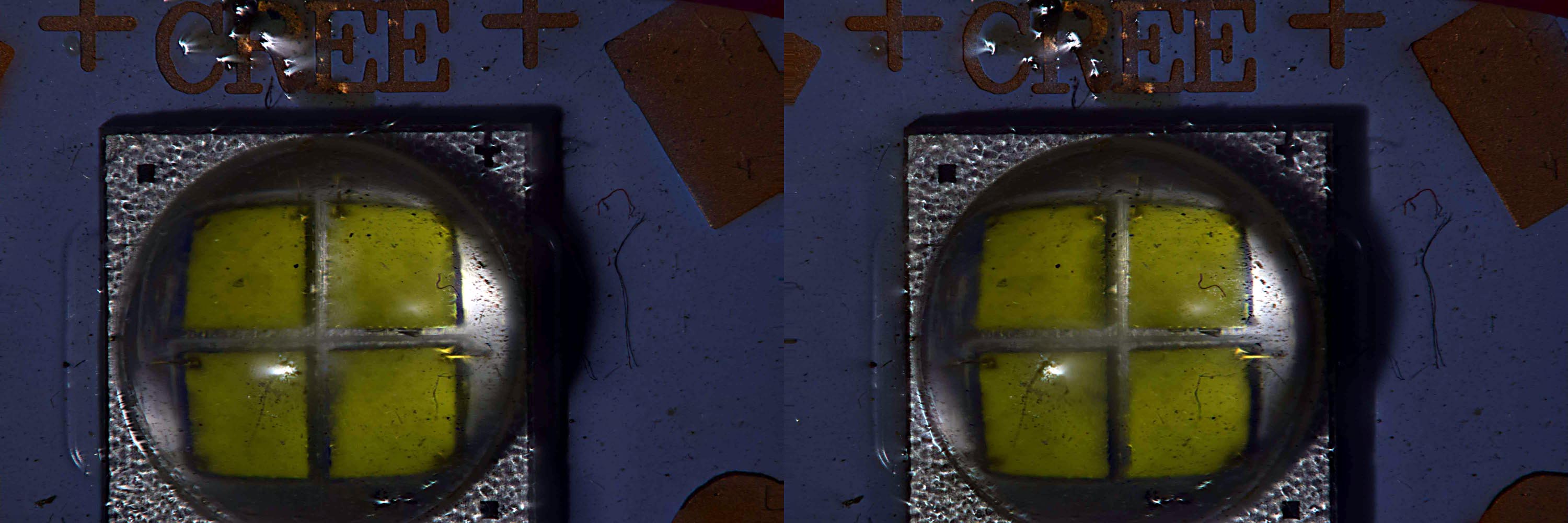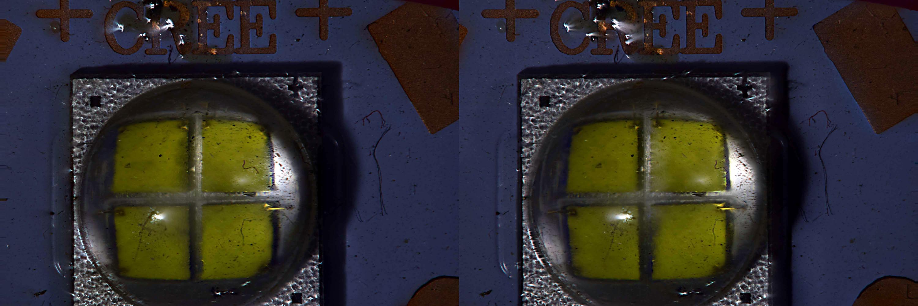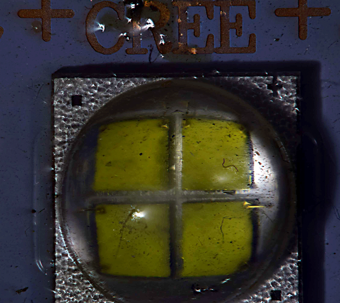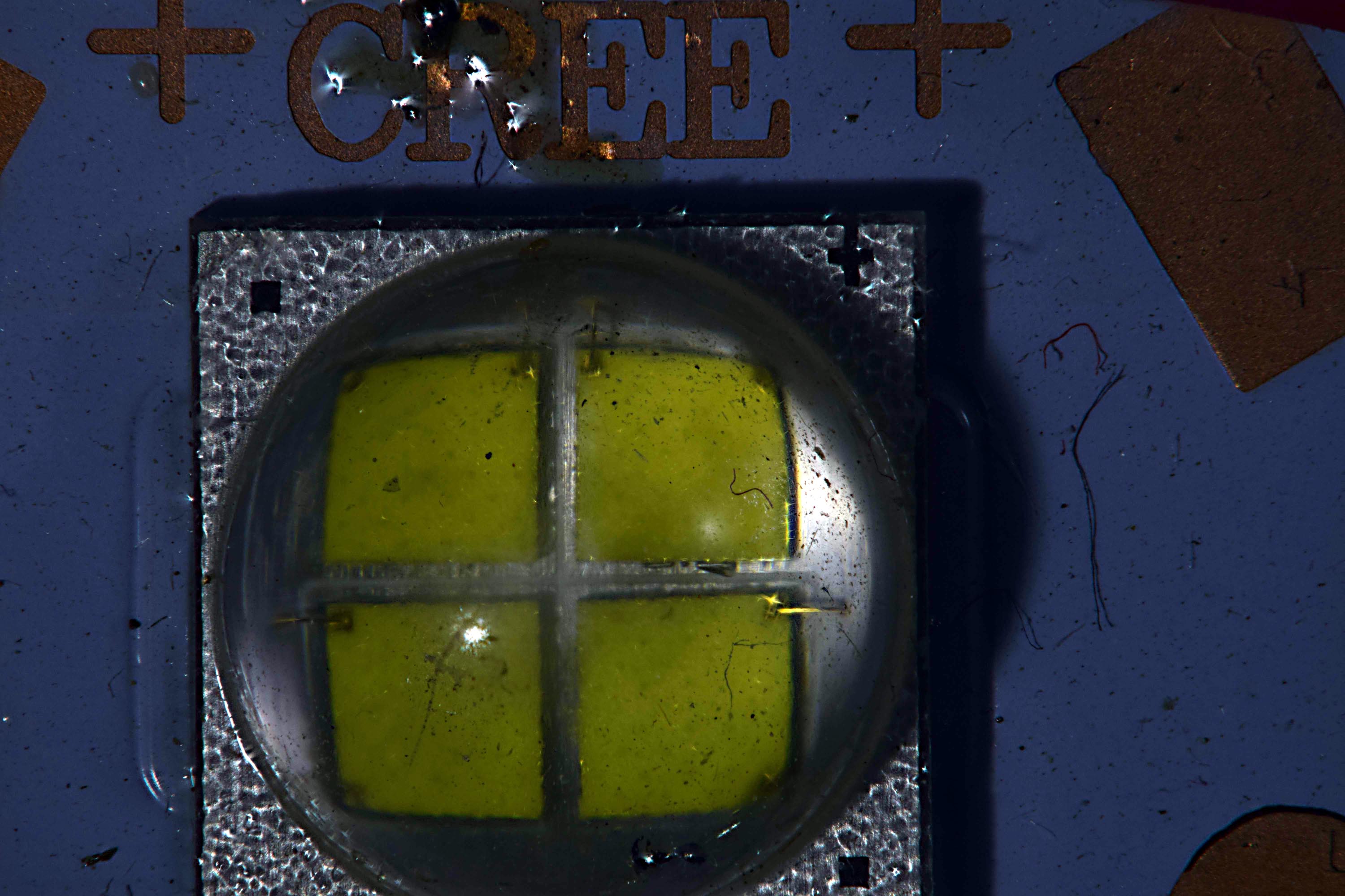 Again using a reversed 105 mm focal length medium format lens for the Pentax 67, I obtained the following stack of 39 images of a Cree 15 W LED, with it's hemispherical lens.