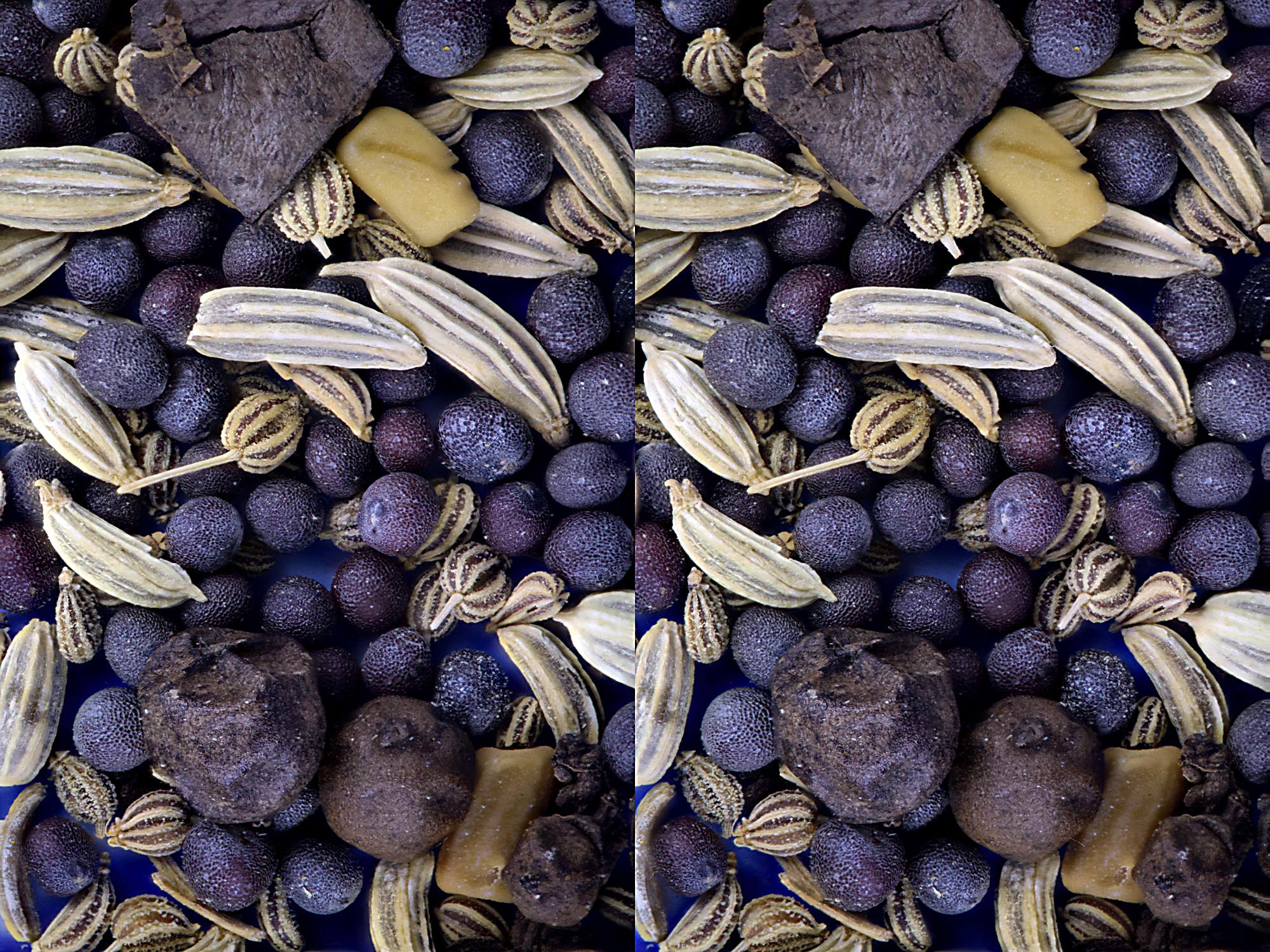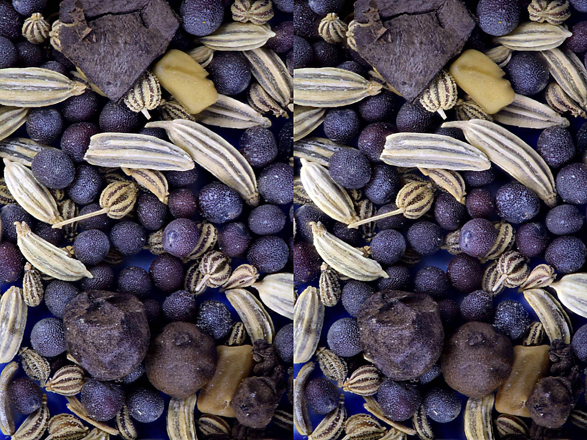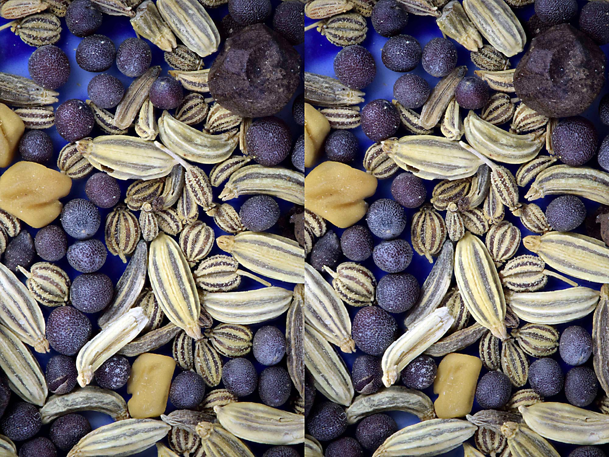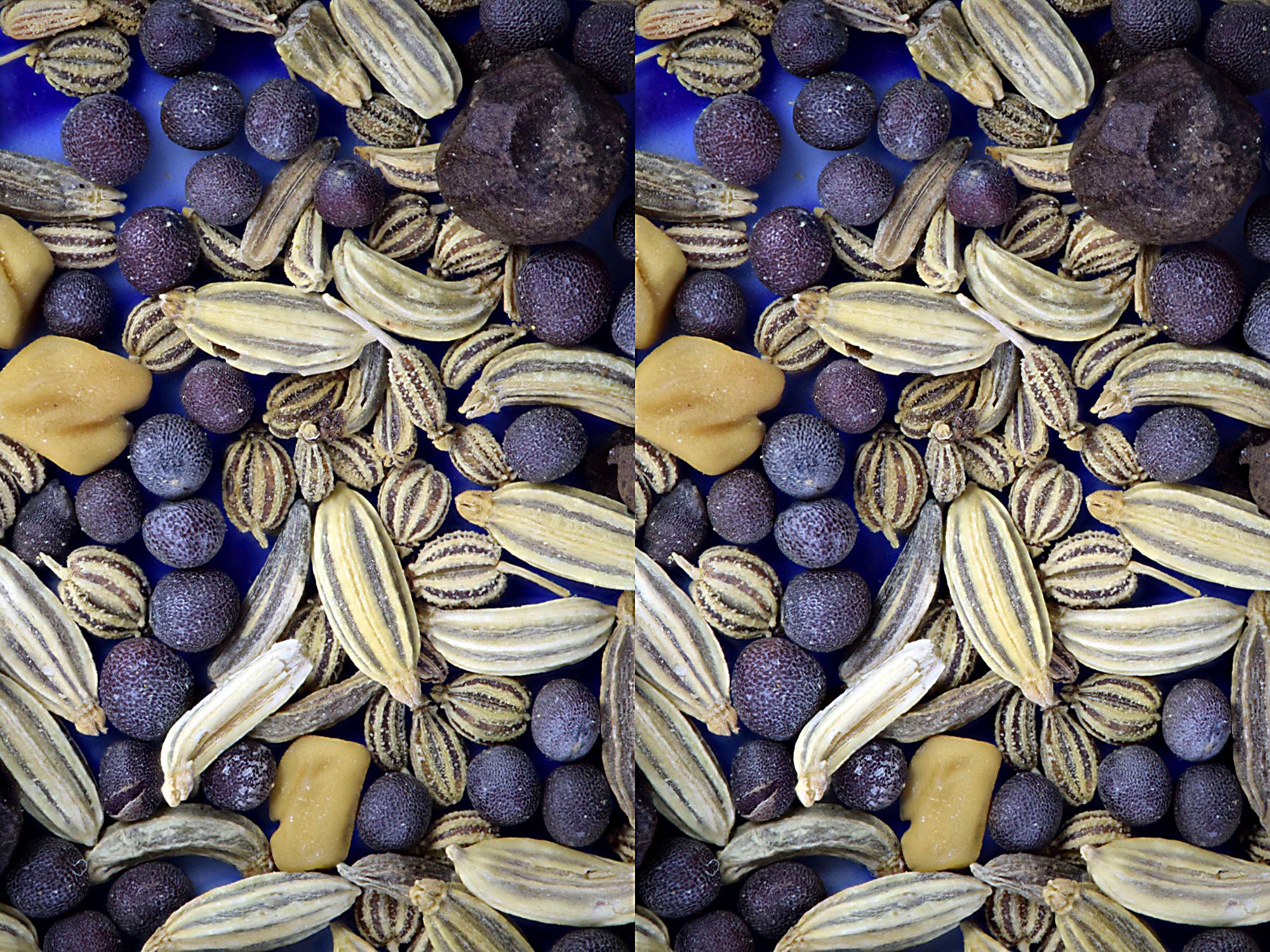 Now with a reversed Pentax 67 200 mm lens (1:1), I obtained the following stacks of ~70 images of Indian spice seeds.