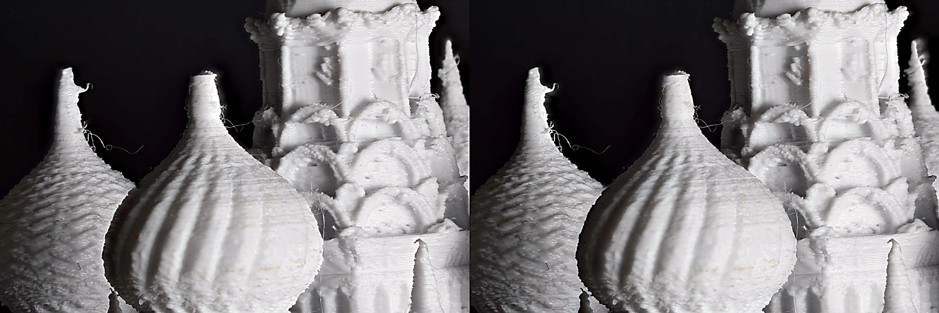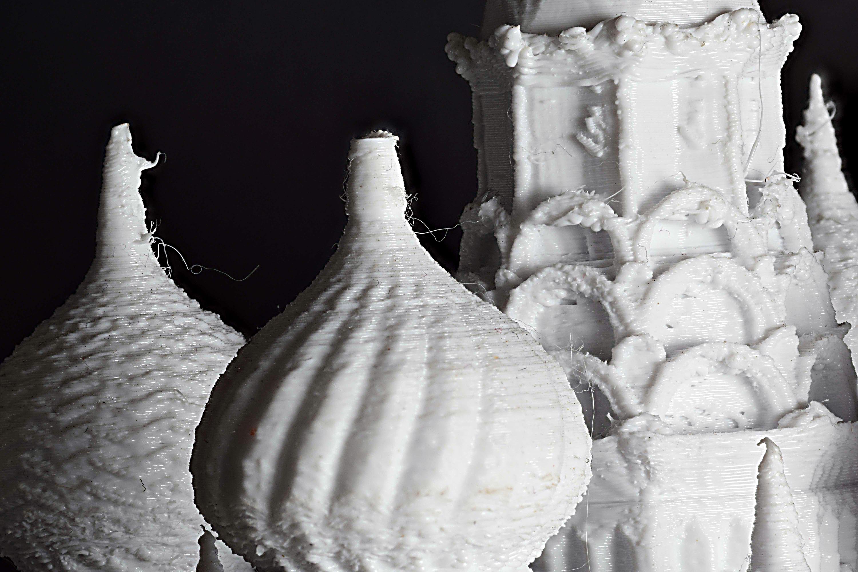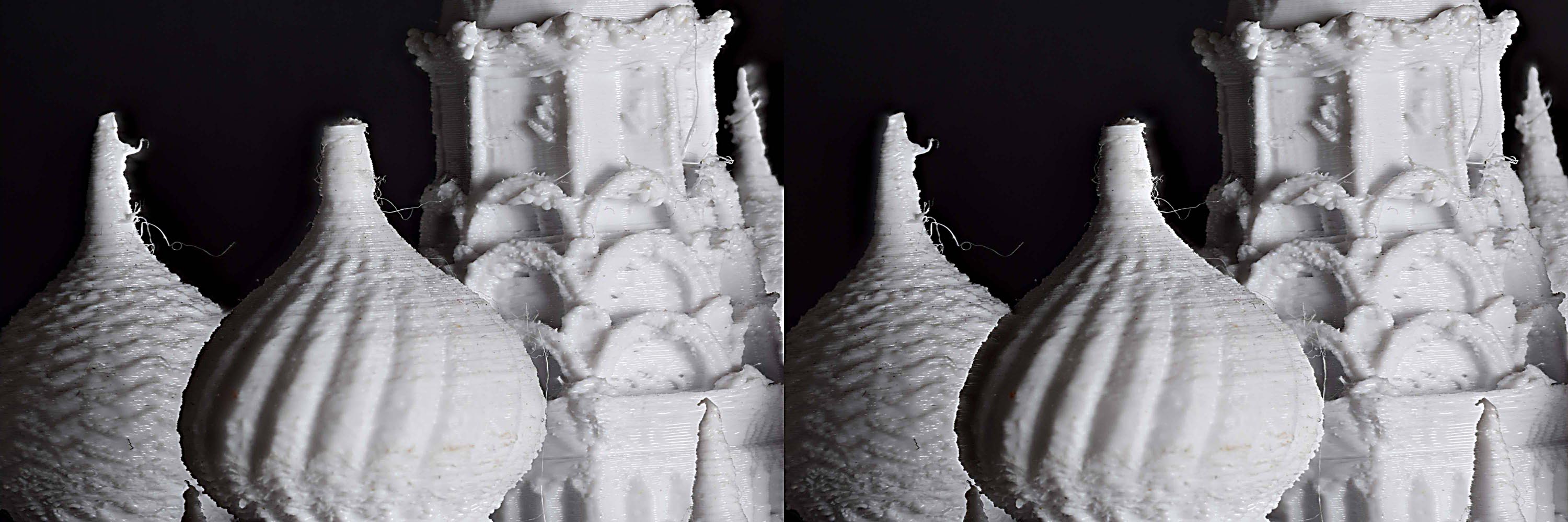 My first attempt with a horizontal macro rig uses bellows with a reversed enlarger lens, the Schneider Componon S 100 mm f/5.6 - a beautiful lens! This is a Zerene PMax stack of 34 images at ISO 200 with 1/200th second exposures with an off-camera flash. The subject is a PLA 3D print of St. Basil's Cathedral. The stack covered over 35 mm in depth!