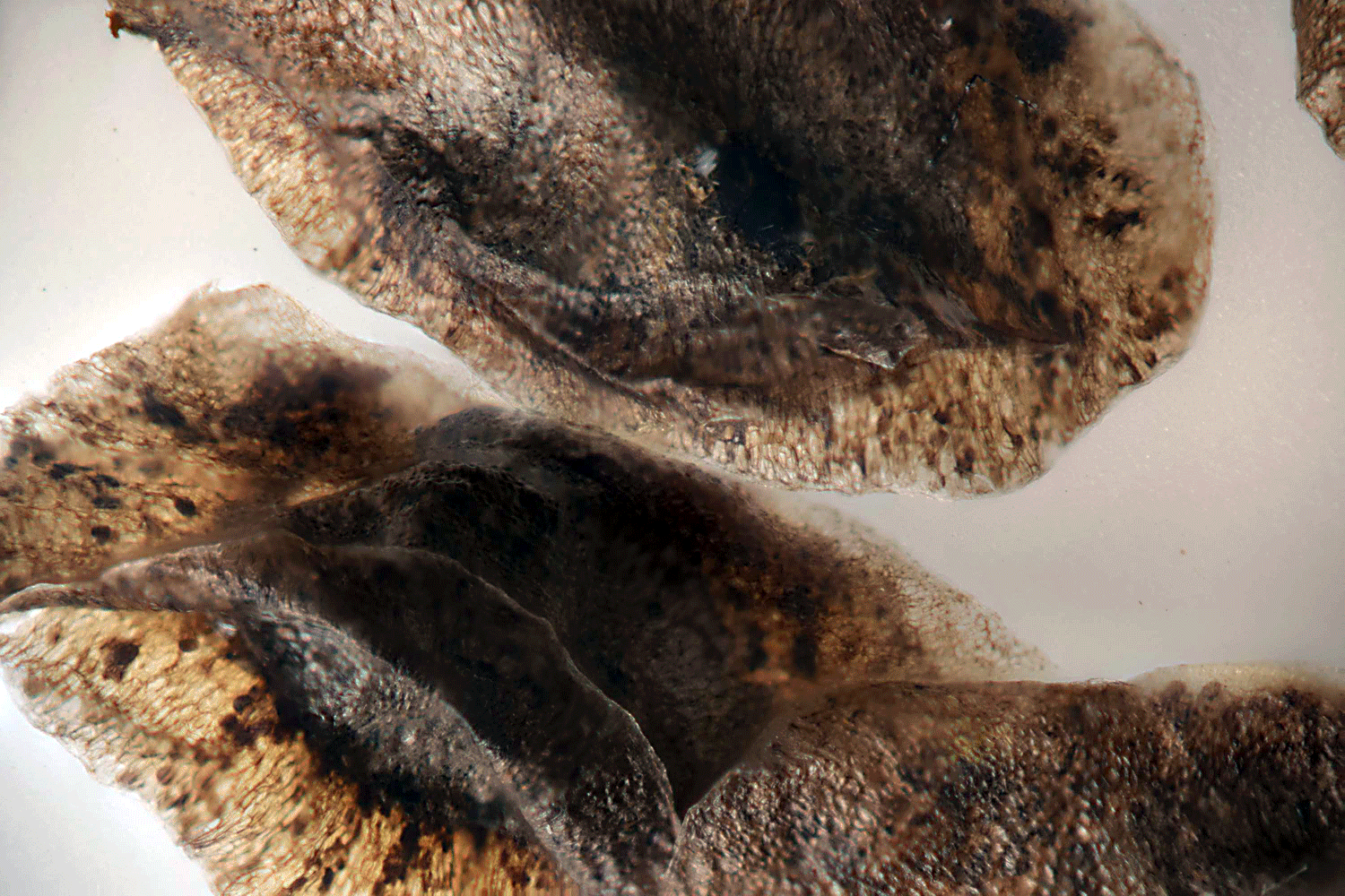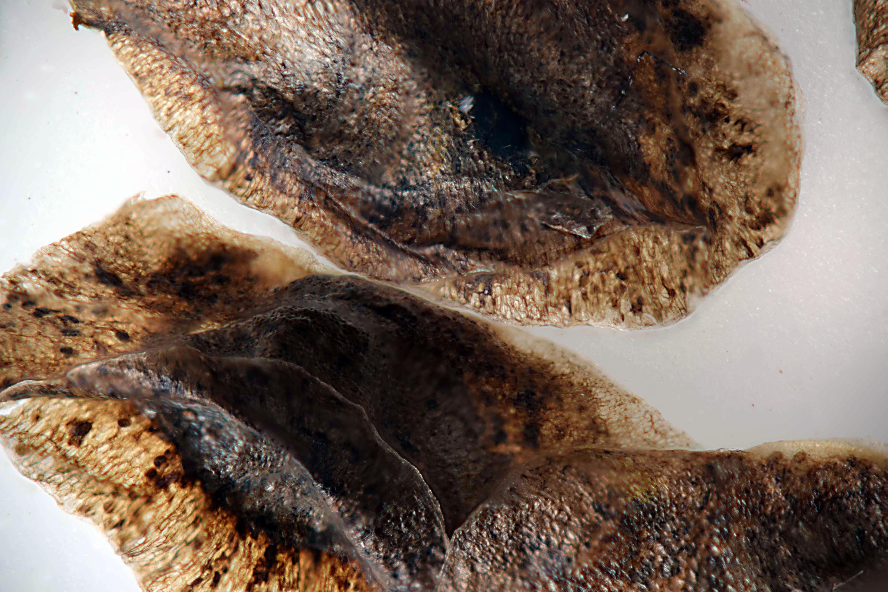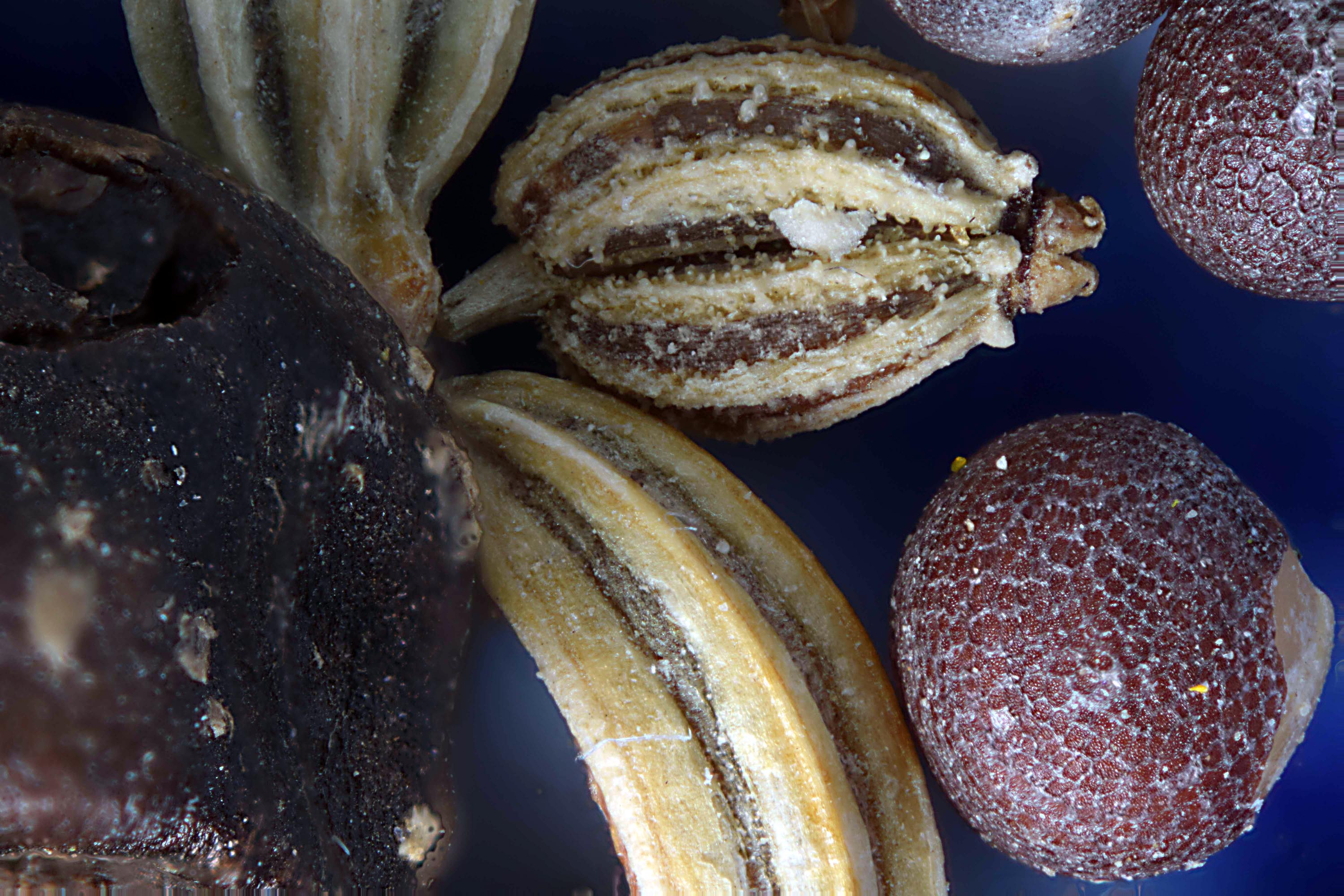 Next, we have a couple of aloe vera seeds, with a solid core and paper-like exterior surfaces. This is a Zerene DMap stack of 11 images at ISO 100 with 1/200th second exposures with a flash with the reversed Pentax 67 55 mm lens at f/4 with the Nikkor 55-200 mm f/5.6 lens as a tube at 200 mm (3.64:1).