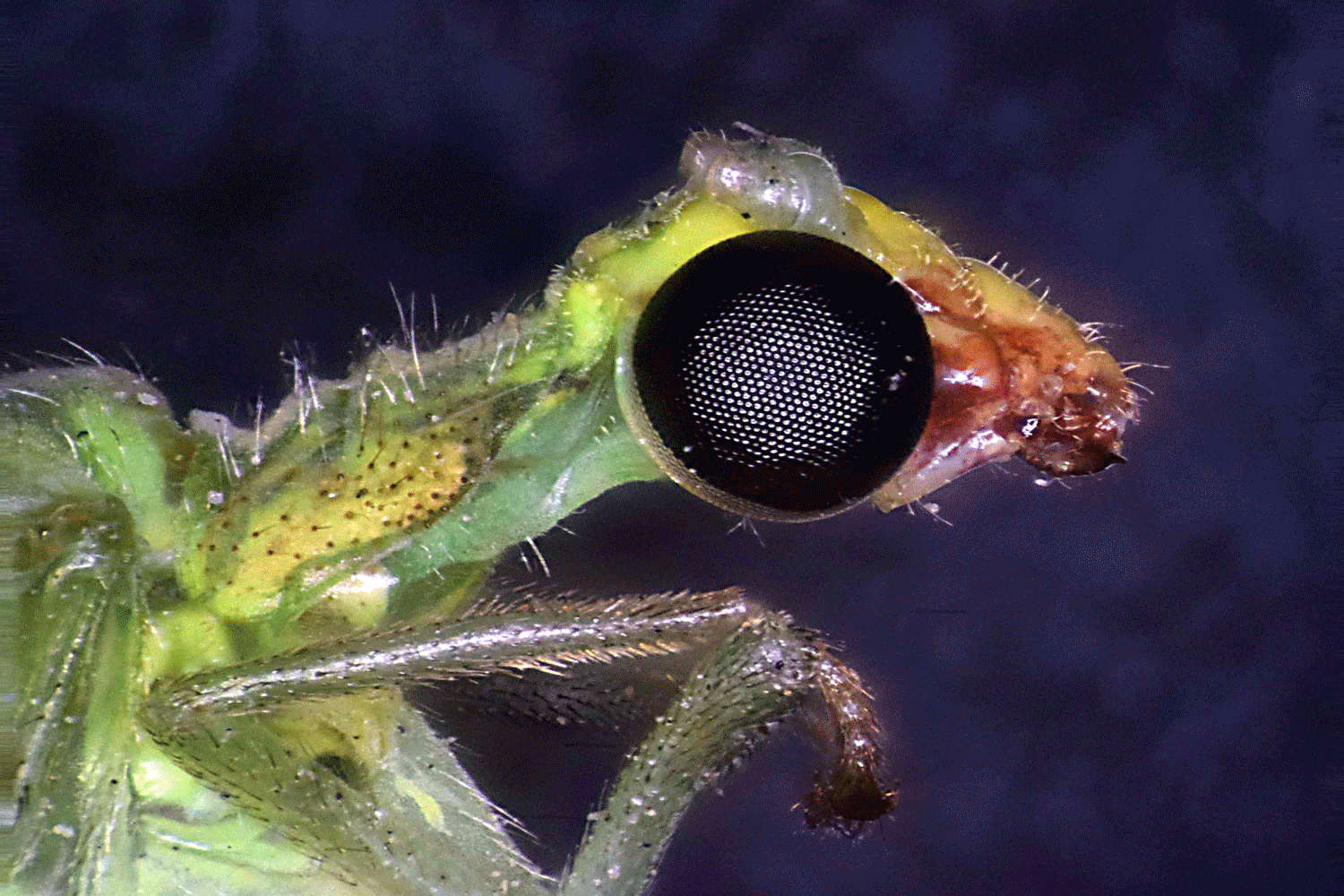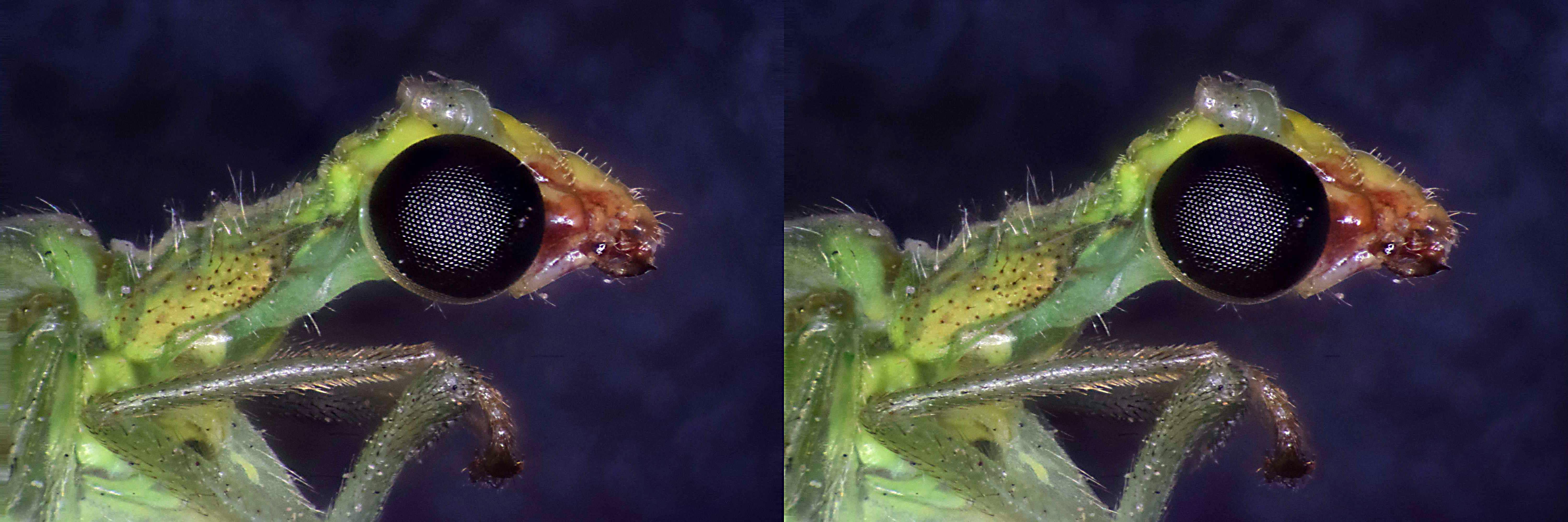Here is a 5x epi-darkfield stack of the head of an adult green lacewing.