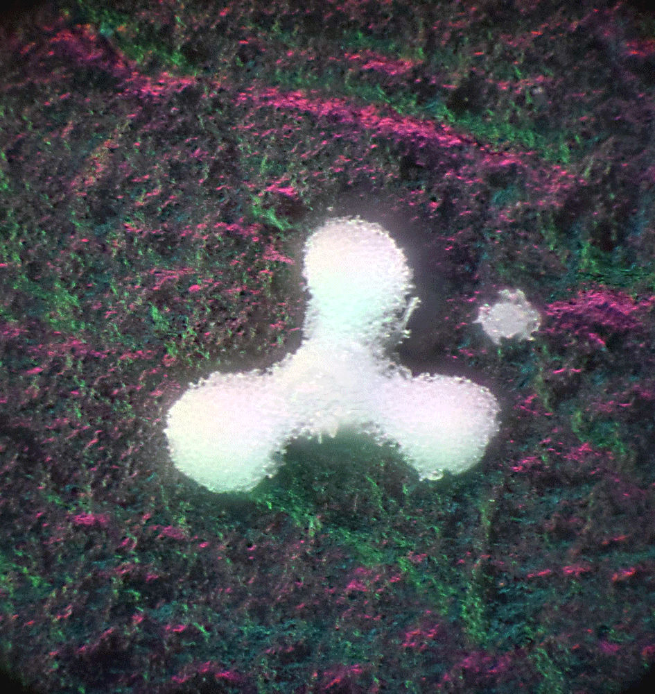 Gorilla Glue (TM) has the interesting property of "foaming up" when it cures. I'm not sure if it is air or oxygen or CO2 or what, but it makes bubbles in the glue. Here we see them in 10x Disco Lights Illumination.