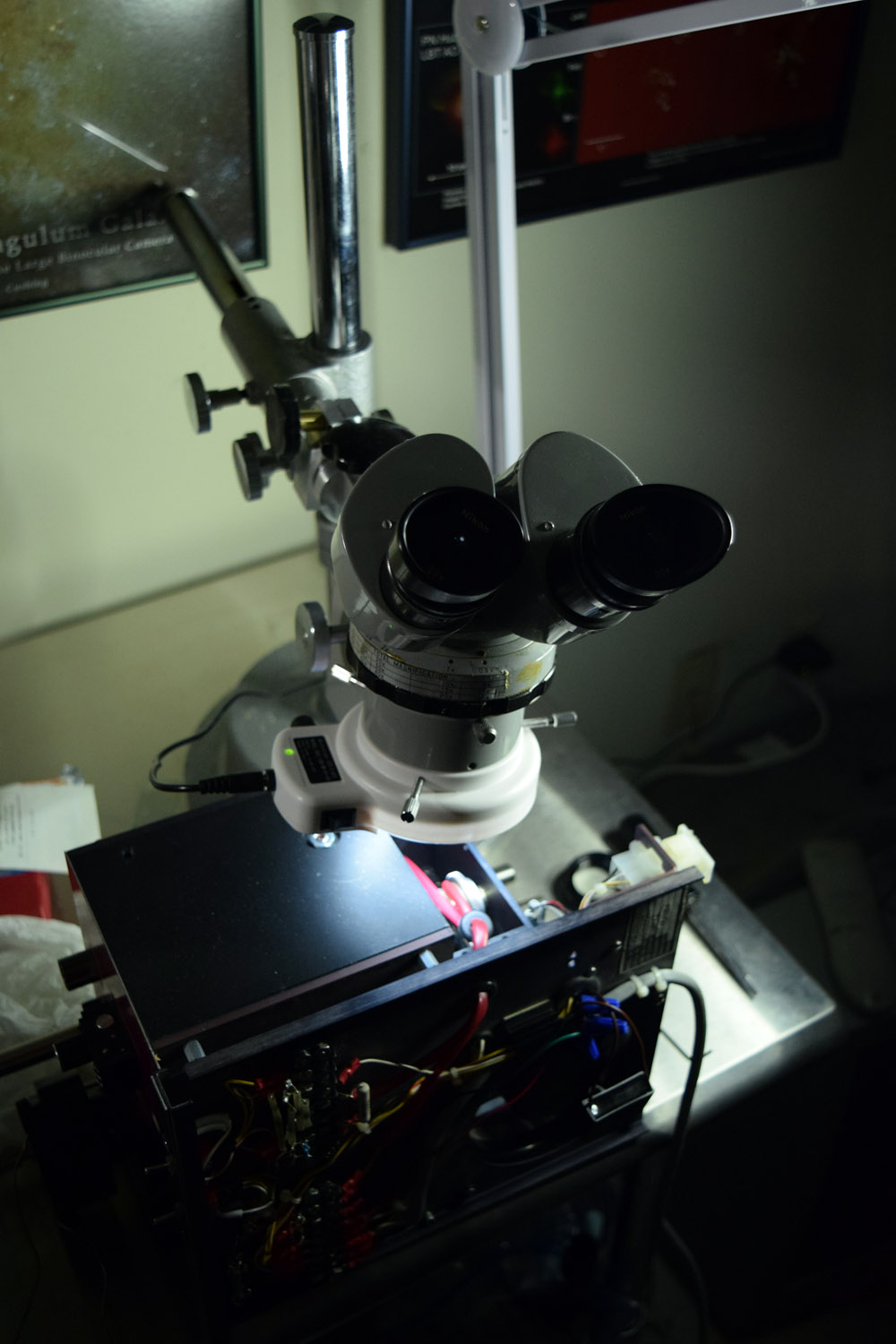 While the original lighting was not sophisticated, it turns out that a modern, cheap, LED ring light fits on there perfectly! It works really nicely for many applications of reflected light stereo microscopy.
