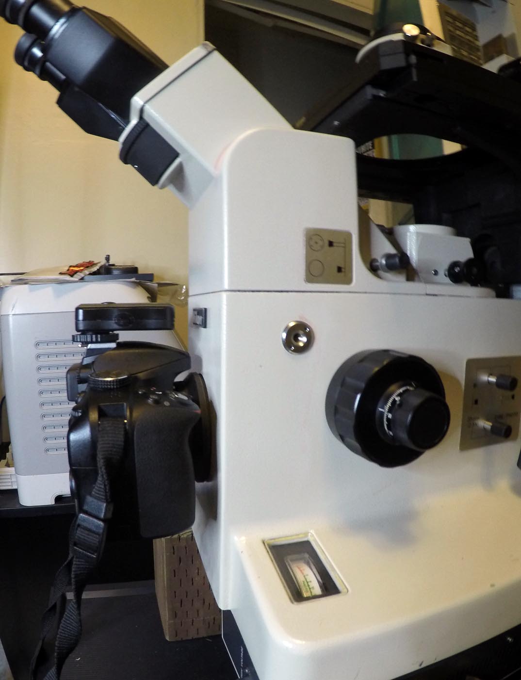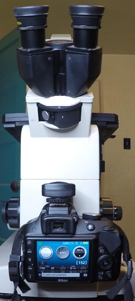 With the Diaphot TMD, it is built as a quadnocular system, with a binocular observation head and two camera ports. The side port can directly take one of the 23.2 mm cameras, or with adapters, medium or even large format digital or film cameras. The front port is an F-mount for 35 mm SLR bodies to directly attach. In this case, I bought a Nikon D3300 specifically to attach to a Diaphot, but it is my primary camera for everyday use, as well.