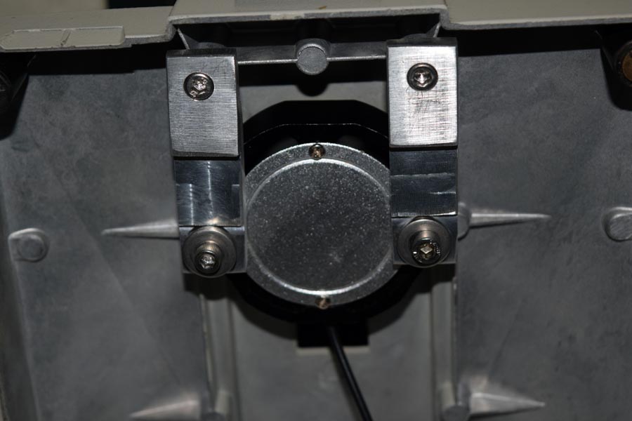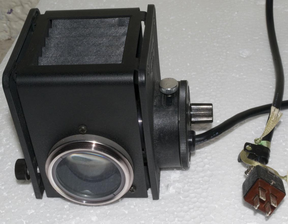 Modern systems, even including epi-fluorescence, are now sometimes powered by LED illumination. Aftermarket retrofit LED lamps are available to give new life to an old microscope or indeed to add the second light source to a system with only one. Shown below is a Labophot that did not come with diascopic illumination, but I retrofitted a 15 W LED into the base. Adding a collector lens improves brightness and keeps annoying stray light from the microscopist.