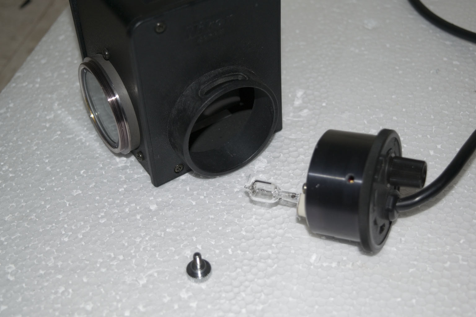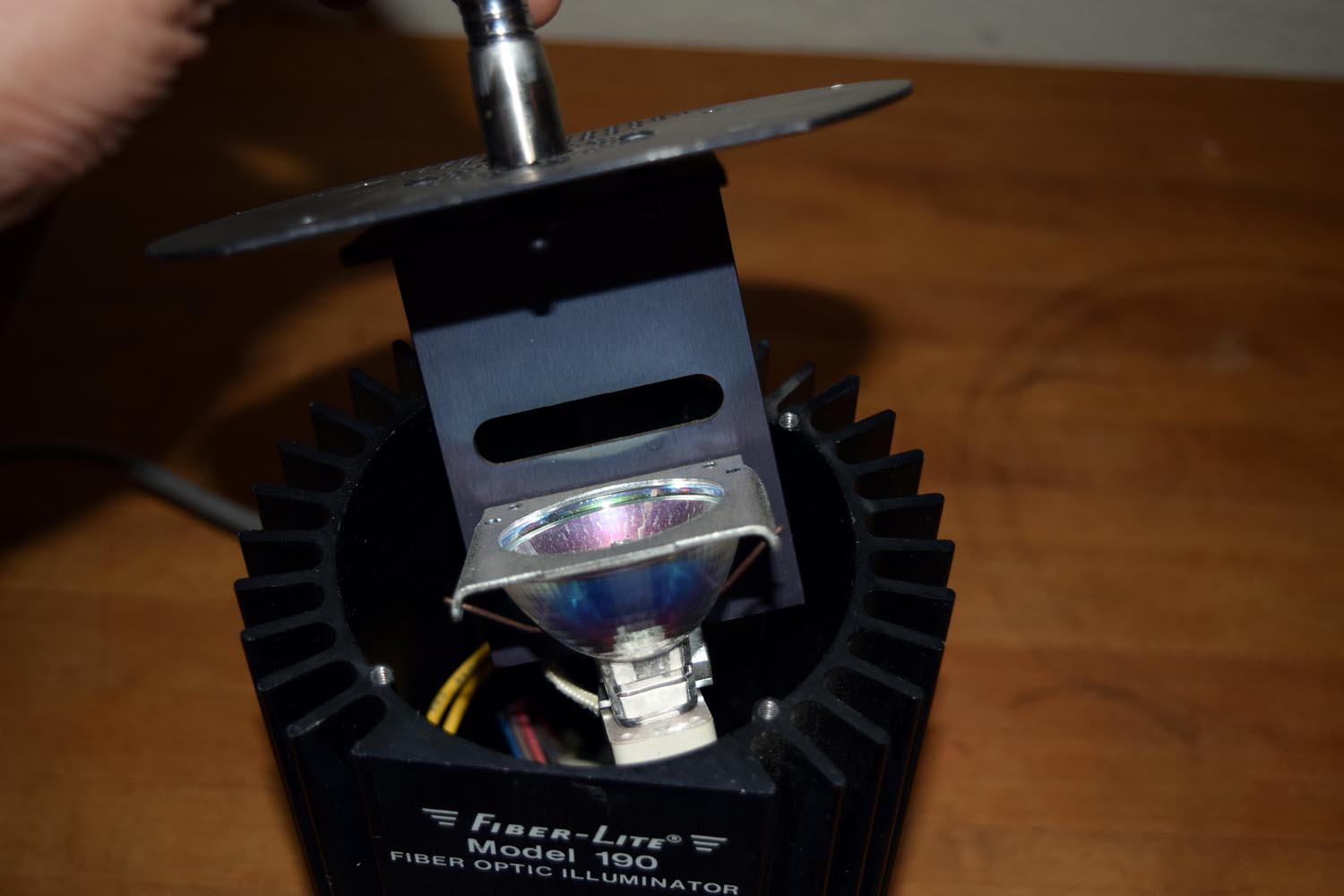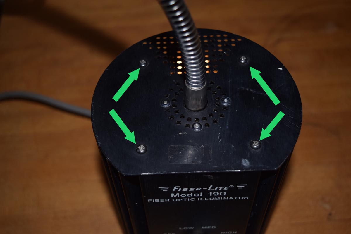 It is fairly easy to replace the lamp in the Dolan-Jenner Model 190 Fiber-Light. They take bulbs (model EJA from replacementlightbulbs.com) for the high-intensity version or model EKE for the longer-life lower output version, which are 21 V 150 W bulbs with a parabolic reflector integrated. These are the Osram brand high-intensity verison. Simply remove the four indicated screws on the top (after disconnecting power!)