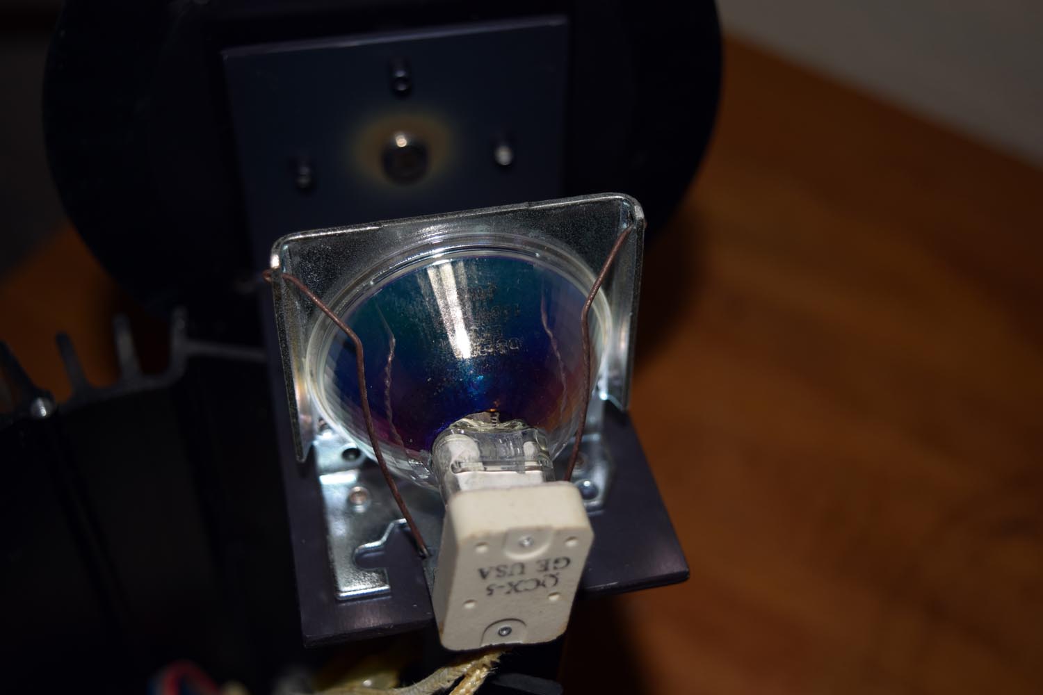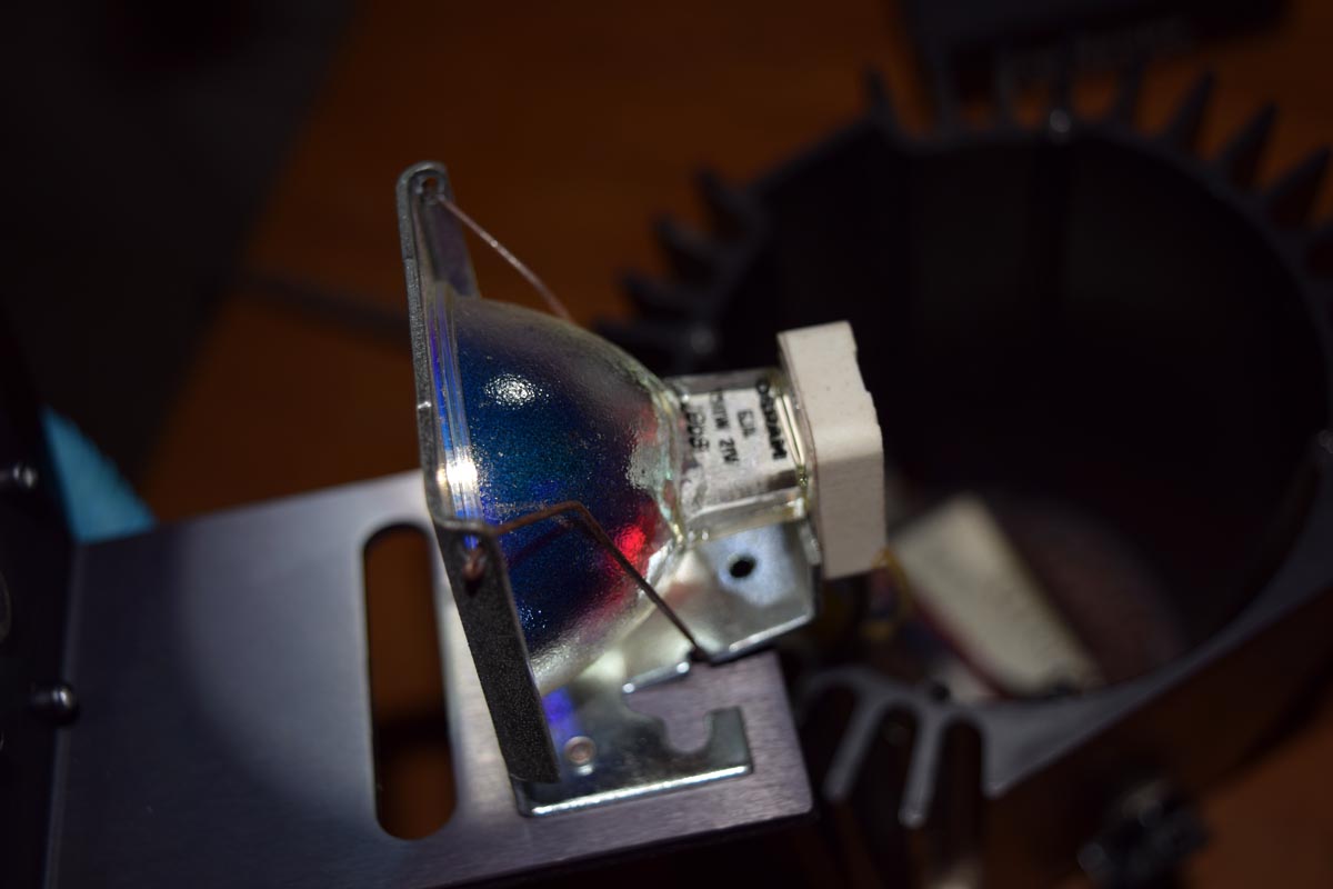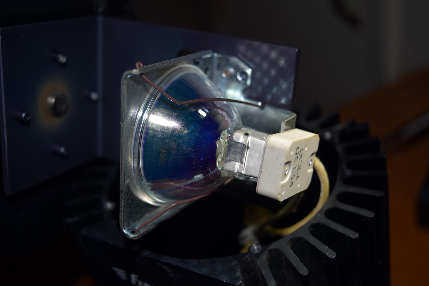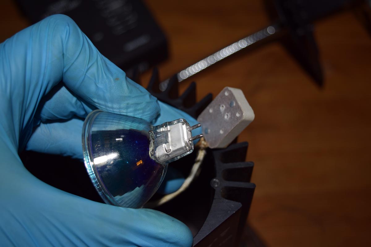It is fairly easy to replace the lamp in the Dolan-Jenner Model 190 Fiber-Light. They take bulbs (model EJA from replacementlightbulbs.com) for the high-intensity version or model EKE for the longer-life lower output version, which are 21 V 150 W bulbs with a parabolic reflector integrated. These are the Osram brand high-intensity verison. Simply remove the four indicated screws on the top (after disconnecting power!)