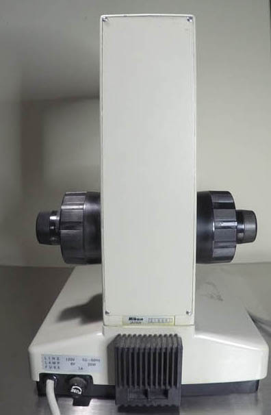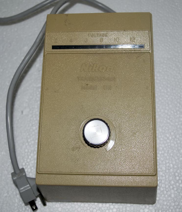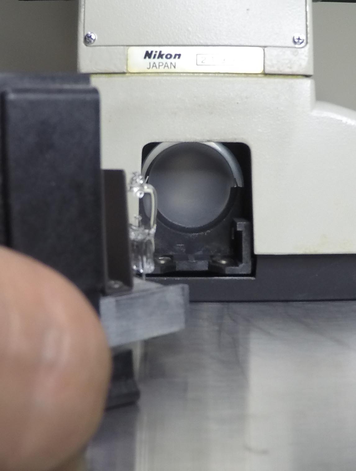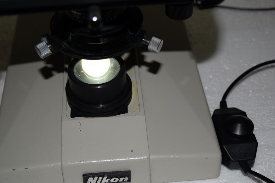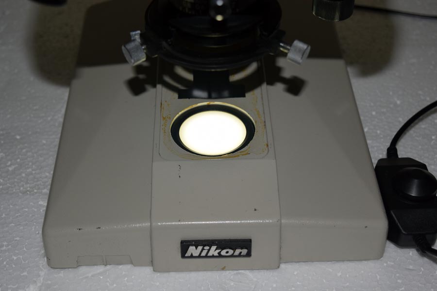 The Eclipse E200, Labophot and Labophot 2 have built-in 20 W halogen lamp houses. These lamp houses are quite often broken on used Labophot 2 microscopes, but rarely on the original. Some versions of The labophot included no provision for diascopic illumination - there was no bottom light and the condenser stage, if present at all has no rack and pinion, which I assume is the way it shipped from the factory.