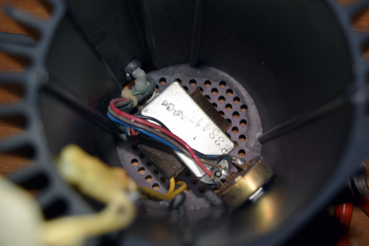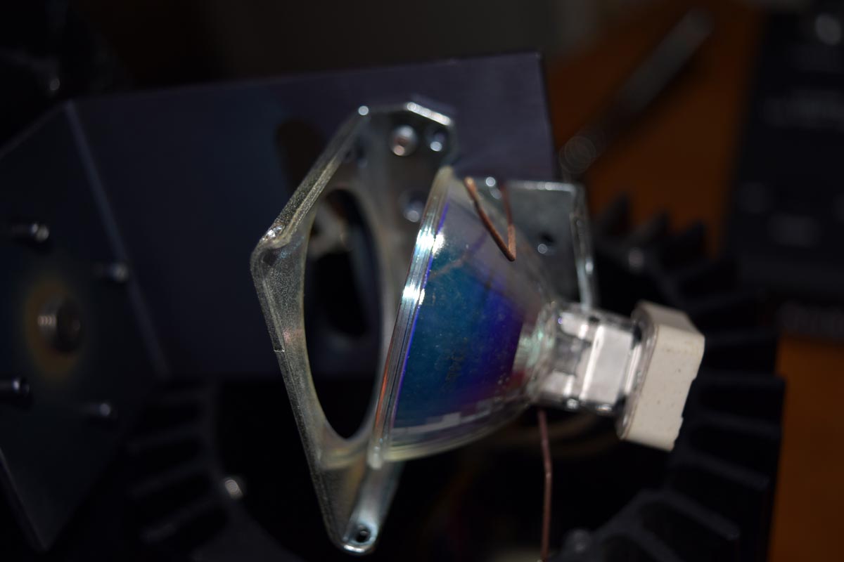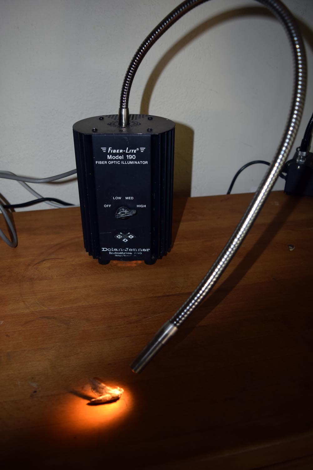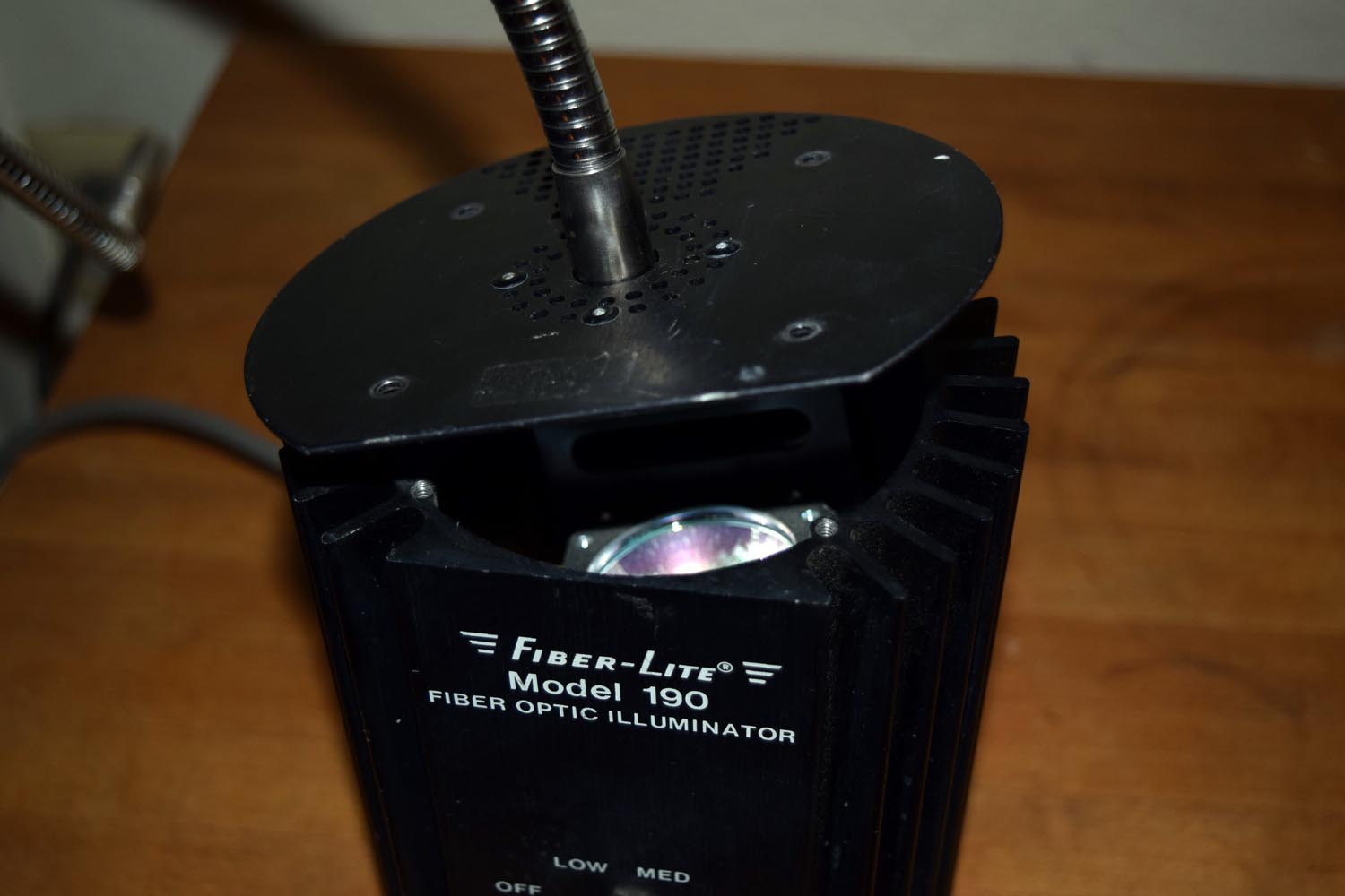 Electrically, it appears to be a simple four position potentiometer (Off, Low, Medium, High) and a transformer. You may notice the light / heat induced damage to the black anodizing around the input to the fiber - that is a pretty serious lamp!
